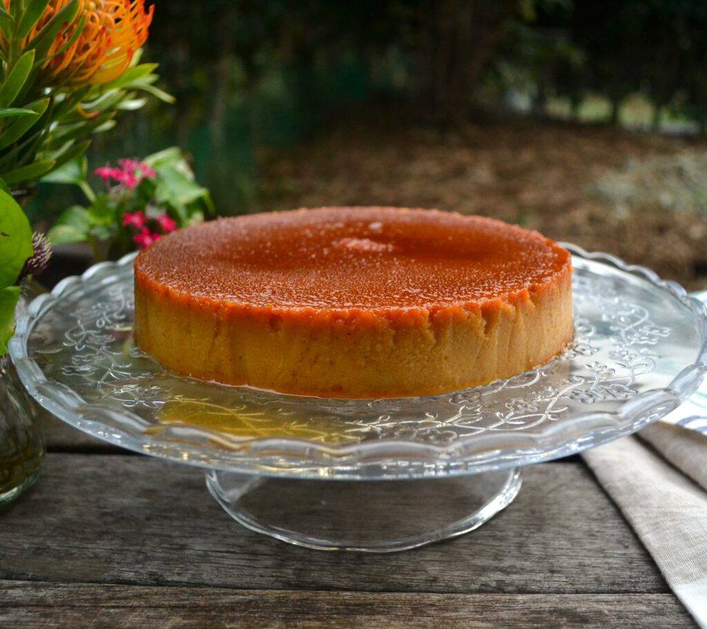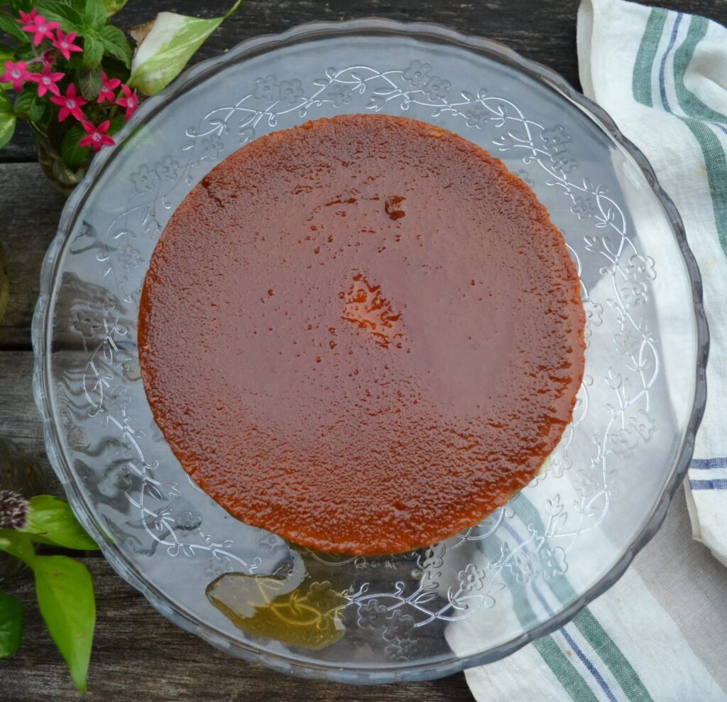 粗熱が取れたら冷蔵庫に入れて、よく冷やしておきます。盛り付けるときは、キャラメルソースが固まっているので、熱湯に少しだけケーキ型をつけて、キャラメルソースを溶かしておきます。さらに、側面の生地が、焼き型にくっついているので、ケーキ型の側面に、ナイフを刺して、生地が外れやすいようにしておきます。平たいお皿やケーキスタンドをかぶせて、一気にひっくり返して、盛り付けます。キ