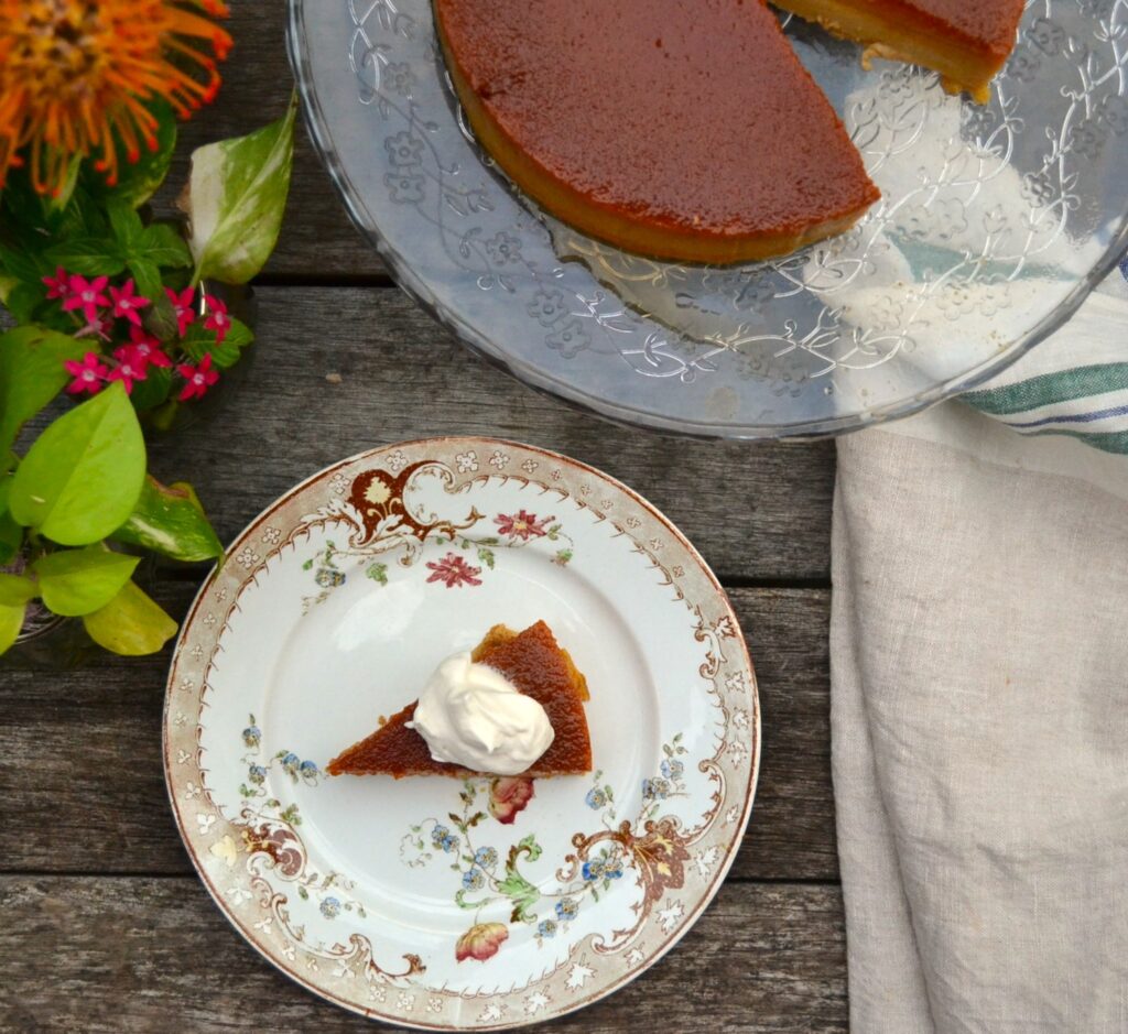 パンプキンをピューレ状にして加え、パンプキンスパイスを入れた、パンプキンフラン (pumpkin flan)です。アメリカの秋の味覚である、パンプキンパイの味を、フランとして再現します。