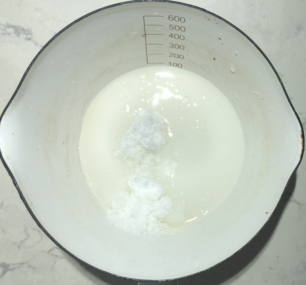 牛乳とエバミルクを少しずつ注ぎ、よく混ぜ合わせます。より滑らかな口当たりにしたい時は、笊でこしておくといいです。