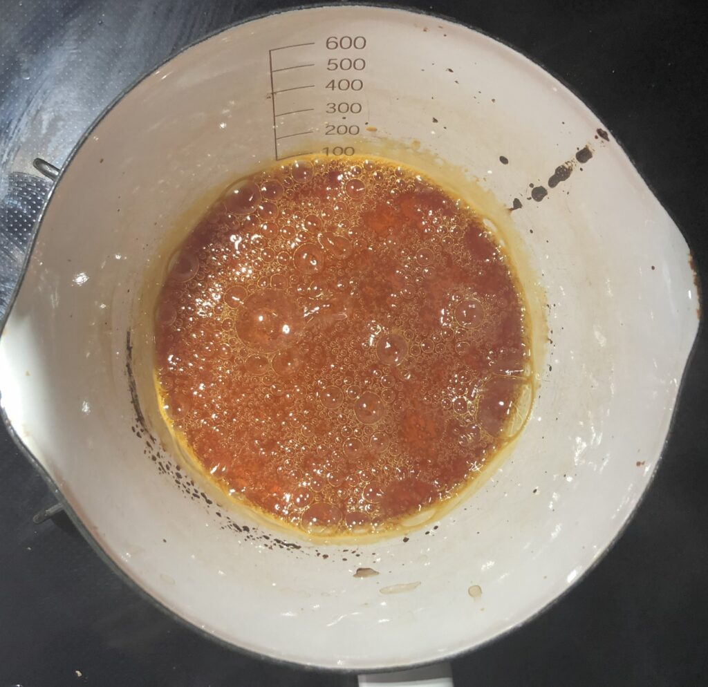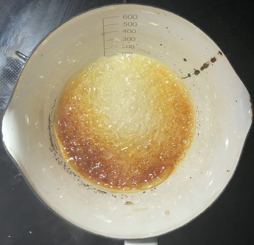 沸騰してきたら、火を弱めます。すこし焦げ目がついてきたら、小金色になるまで注意深く見守り、鍋を火からおろます。予熱でも火が通るので、少し明るい飴色くらいで火を止めるのがポイントです。