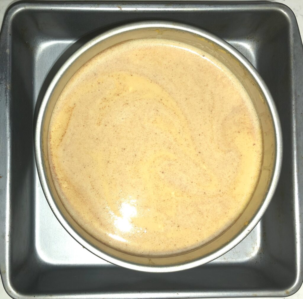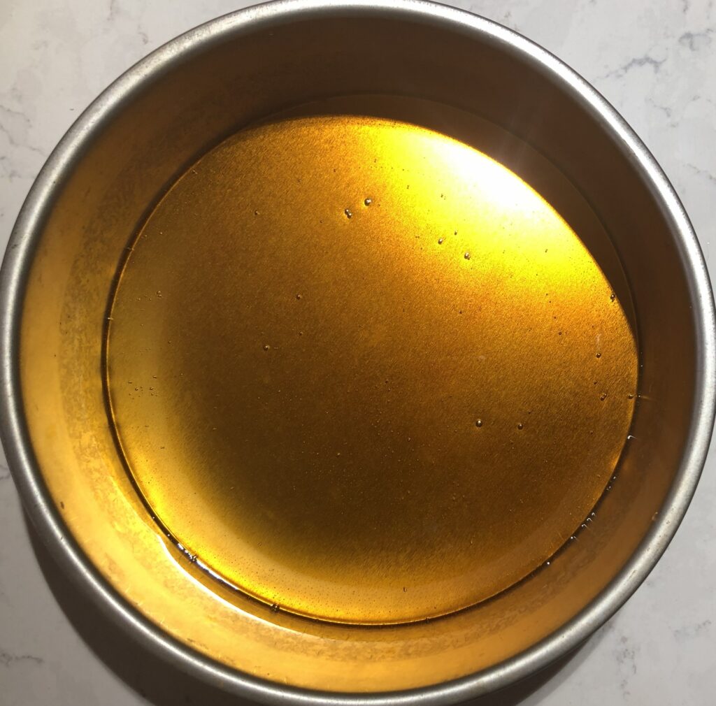 ❷❶ を焼き型に流しいれて、キャラメルソース焼き型の底に均等にいきわたるようにする。