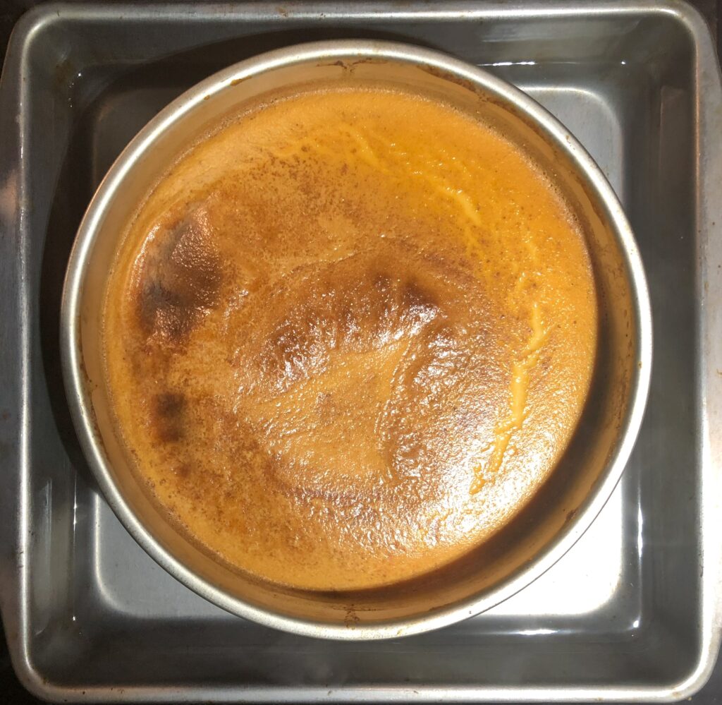 ❺❷ の焼き型にカスタード液を流し入れる。一回り大きな耐熱容器にお湯をはり、その中に焼き型を沈めるようにしておく。温めておいたオーブンで、1時間程度、卵液が固まるまで焼く。