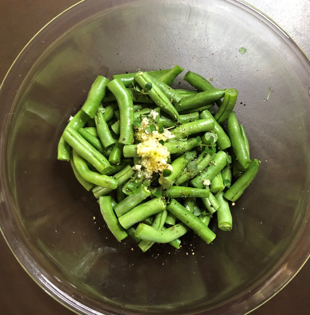 ❹いんげん豆の蔕をとり、食べやすい長さに切りそろえる。ボールに入れて、刻んだニンニク、塩、黒胡椒、オリーブオイルをまぶす。
