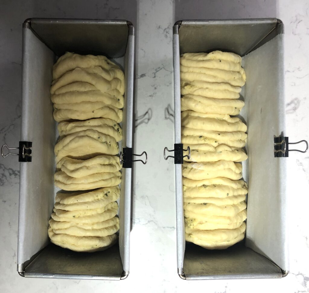 ❻ローフ型に、薄くバターを塗ってから、ベーキング用の紙を敷く。❺ の成形した生地を、12個重ねて、平な面を下にして、ローフ型に入れる。暖かい室内において、一回り大きくなるまで、発酵させる。