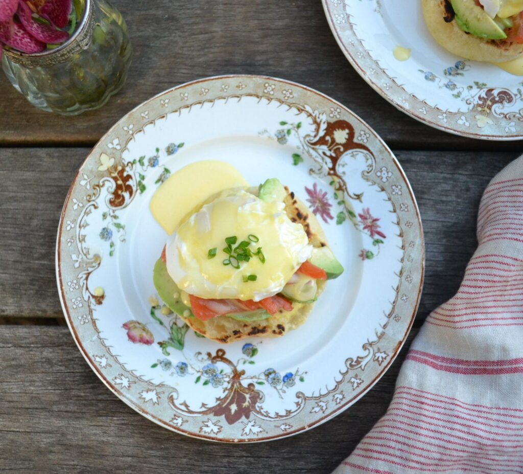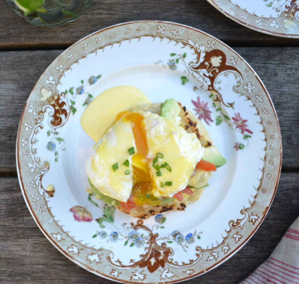 ❸イングリッシュマフィンの上に、アボカド、スモークサーモン、ポーチドエッグをのせて、オーランデーズソースをかける。好みでパセリの微塵切りやパプリカなどをトッピングする。