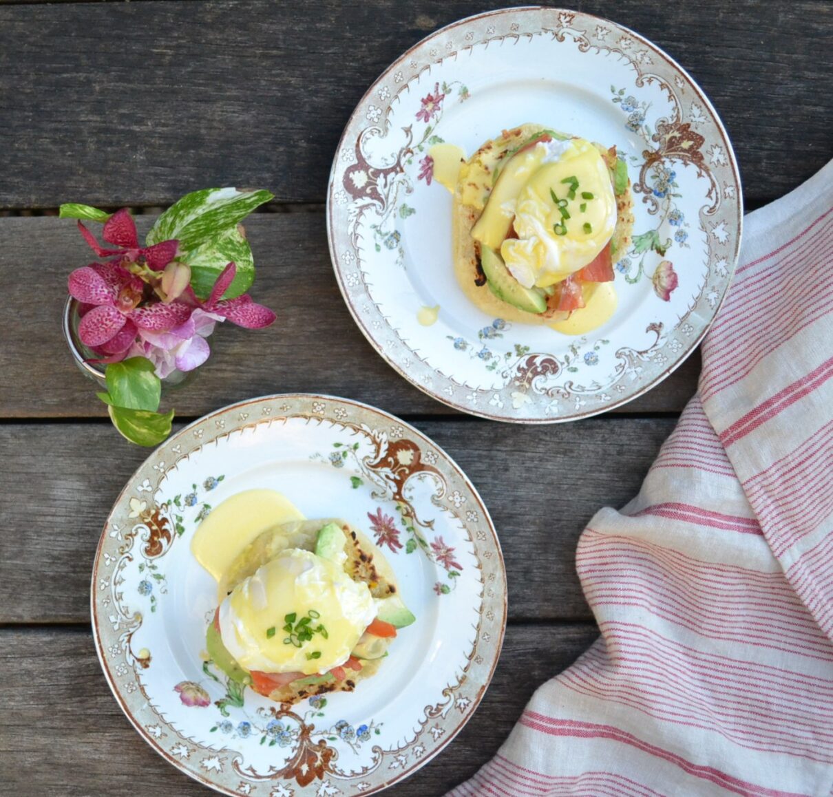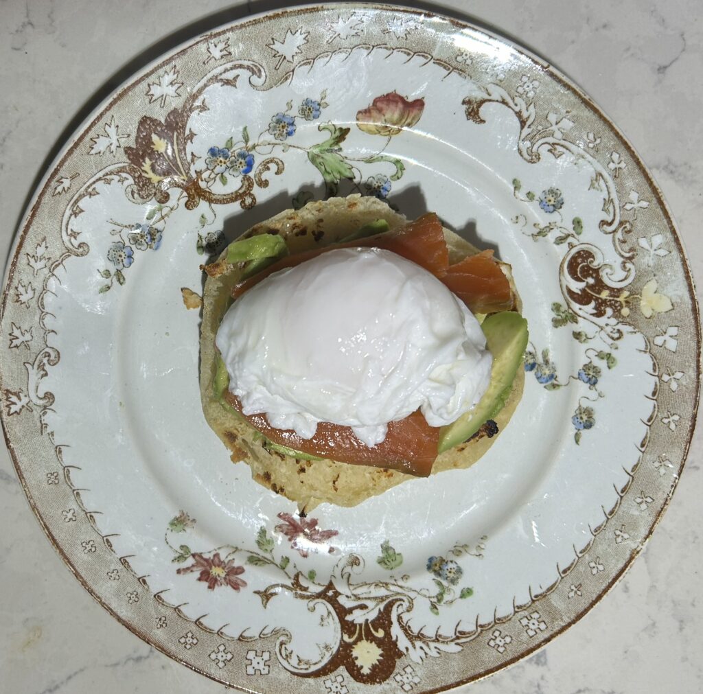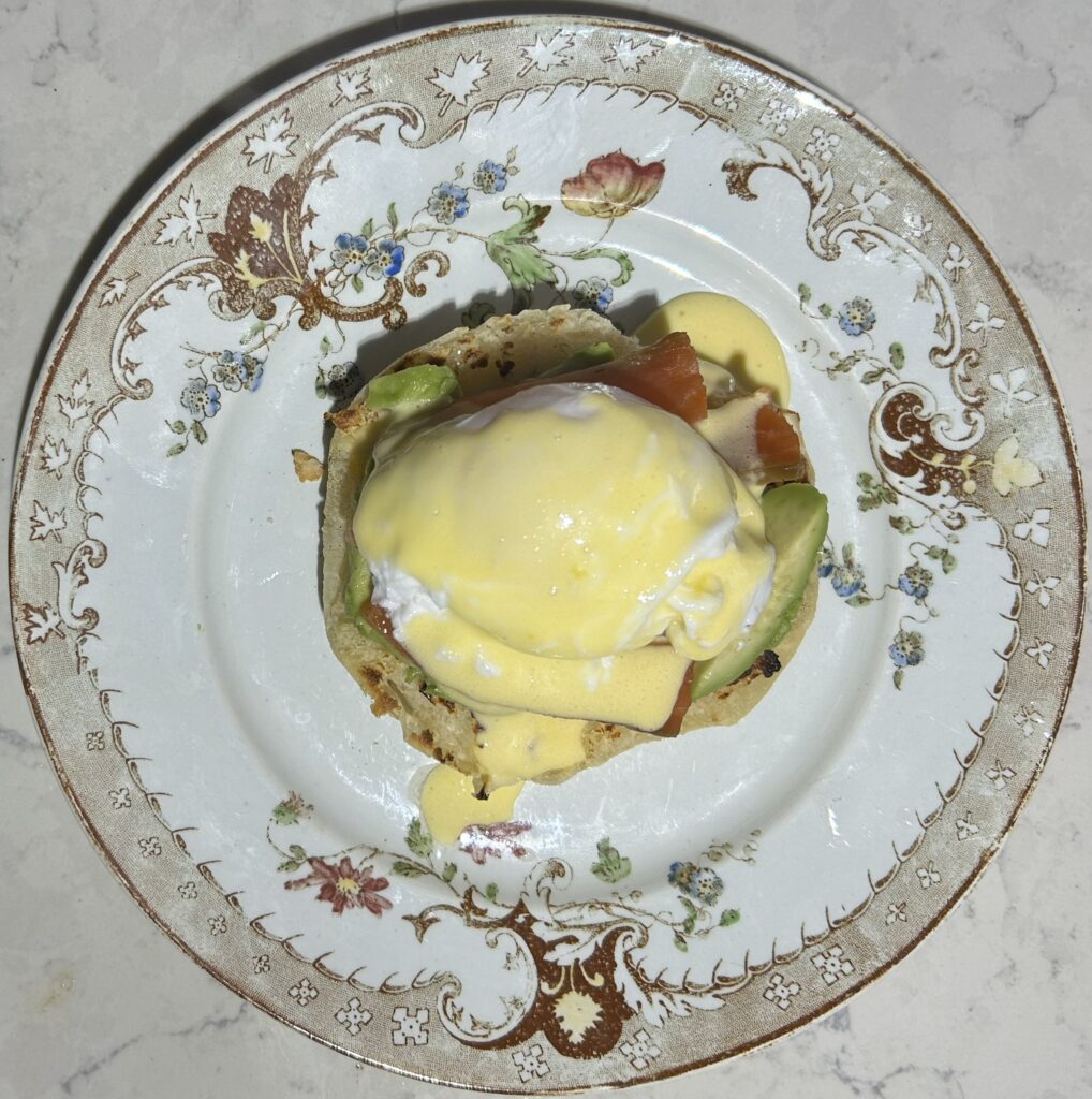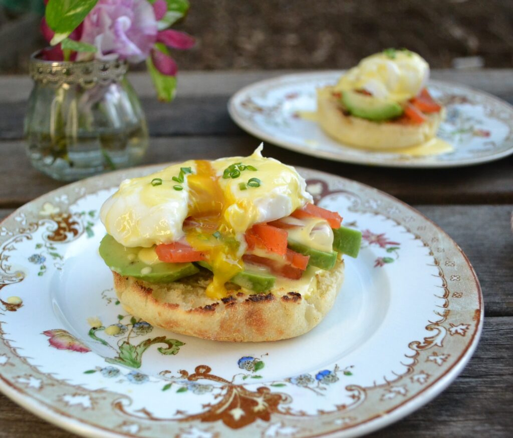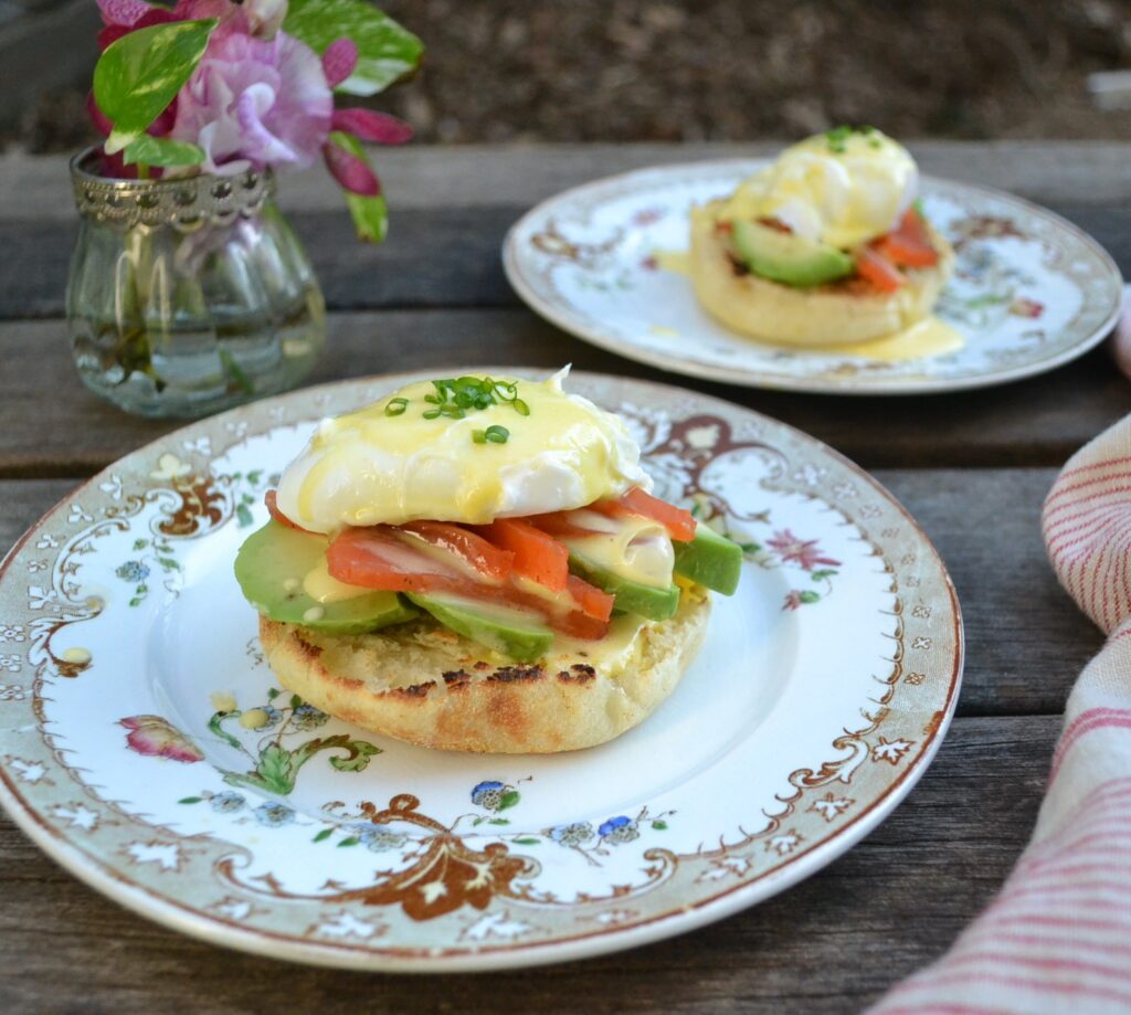 スモークサーモンとアボカドを添えた、サーモンエッグベネディクト (Salmon Egg Benedict) です。エッグベネディクトは、イングリッシュマフィンにポーチドエッグをのせて、オーランデーズソースをかけた、アメリカのブレックファストメニューです。朝ごはんメニューなので、カナディアンベーコンという、脂身の少ない厚めのベーコンを添えることが多いですが、ベーコン以外にも、様々な食材とあわせることが出来ます。サーモンとアボカドは、オーランデーズソースとの相性もよく、色合いも美しい組み合わせです。