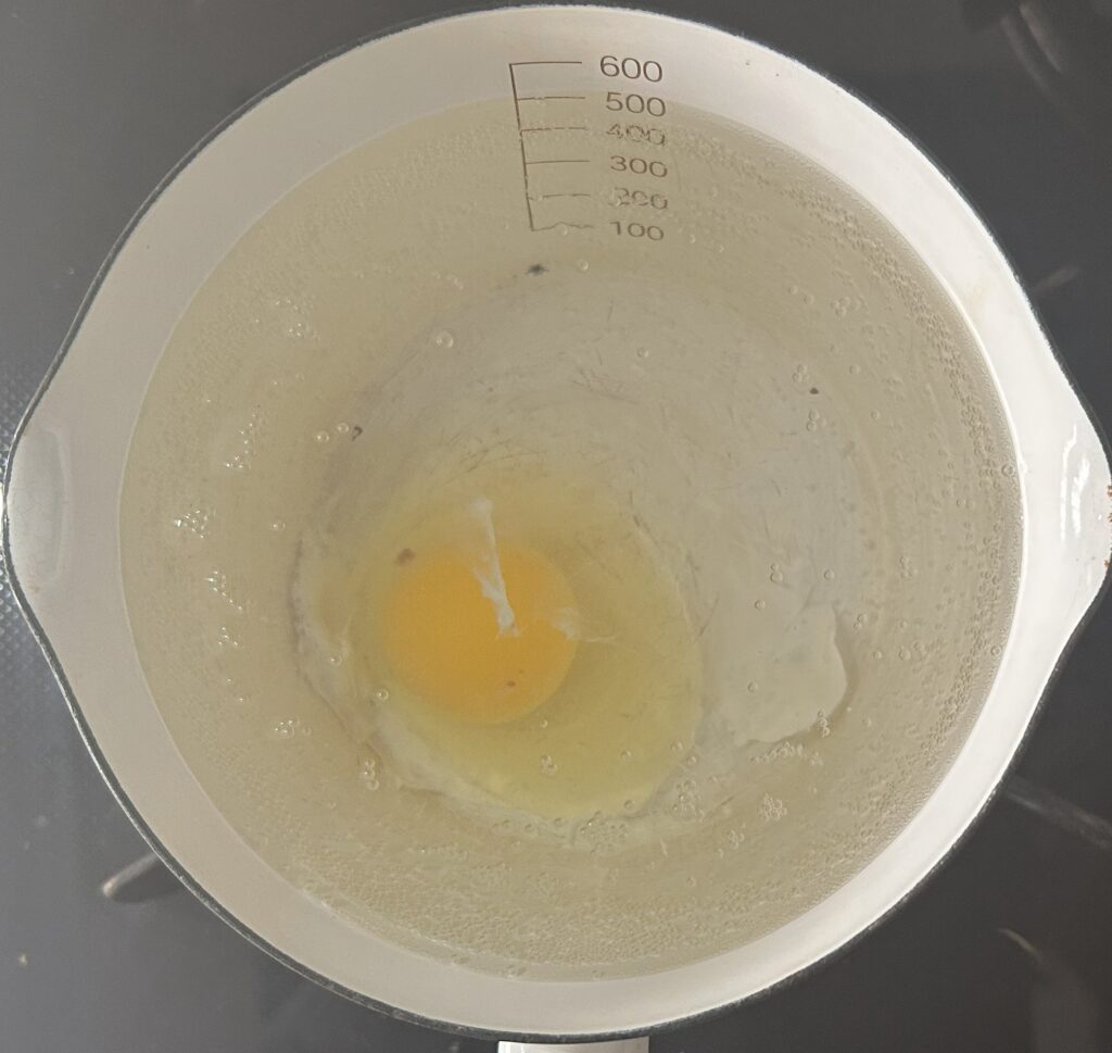 鍋に水を入れて中火にかけます。お湯の温度が、摂氏80度になるまで、加熱します。摂氏80度になったら、卵をゆっくりお湯に入れます。ポーチドエッグを作るときのポイントは、お湯を沸騰させないで、ゆっくりと加熱することです。お湯が煮え立っていると、卵の白身が周囲に飛び散りやすくなります。