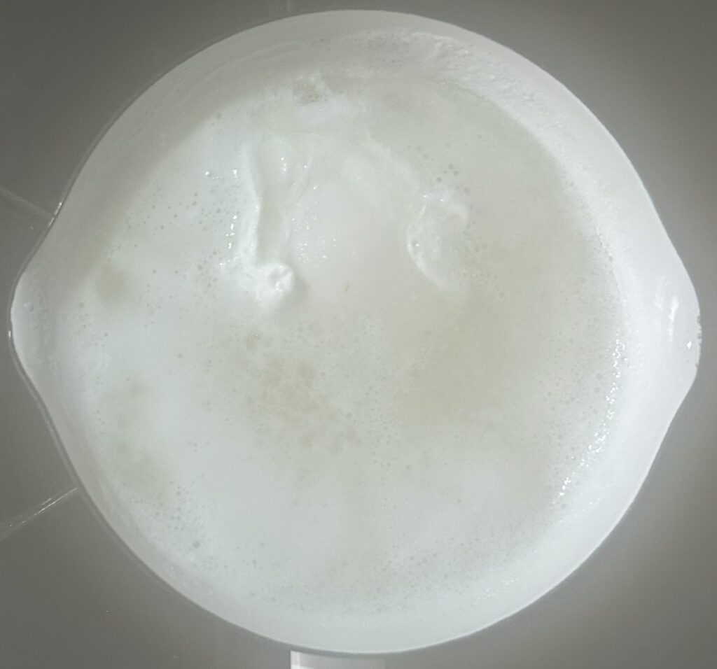 溶かしバターを加えながら、泡立て器でかき混ぜます。