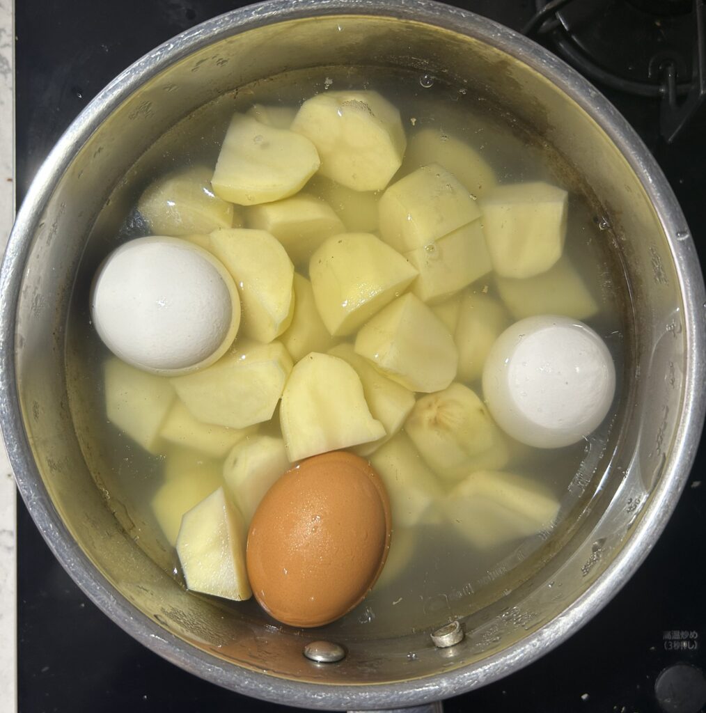 じゃが芋は皮をむいて、茹でやすい大きさにきります。卵とじゃが芋を鍋に入れて、水を注ぎます。中火にかけて、沸騰したら弱火にして、じゃが芋が軟らかくなるまで茹でます。