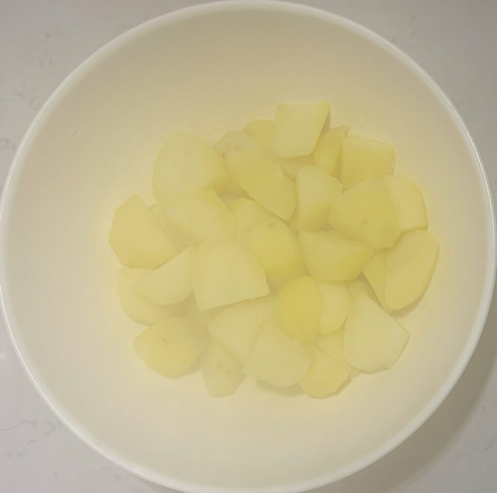 じゃが芋が軟らかくなったら、笊にあけて水気を切り、ボールに移します。茹で卵も殻をむいて、角切りにします。