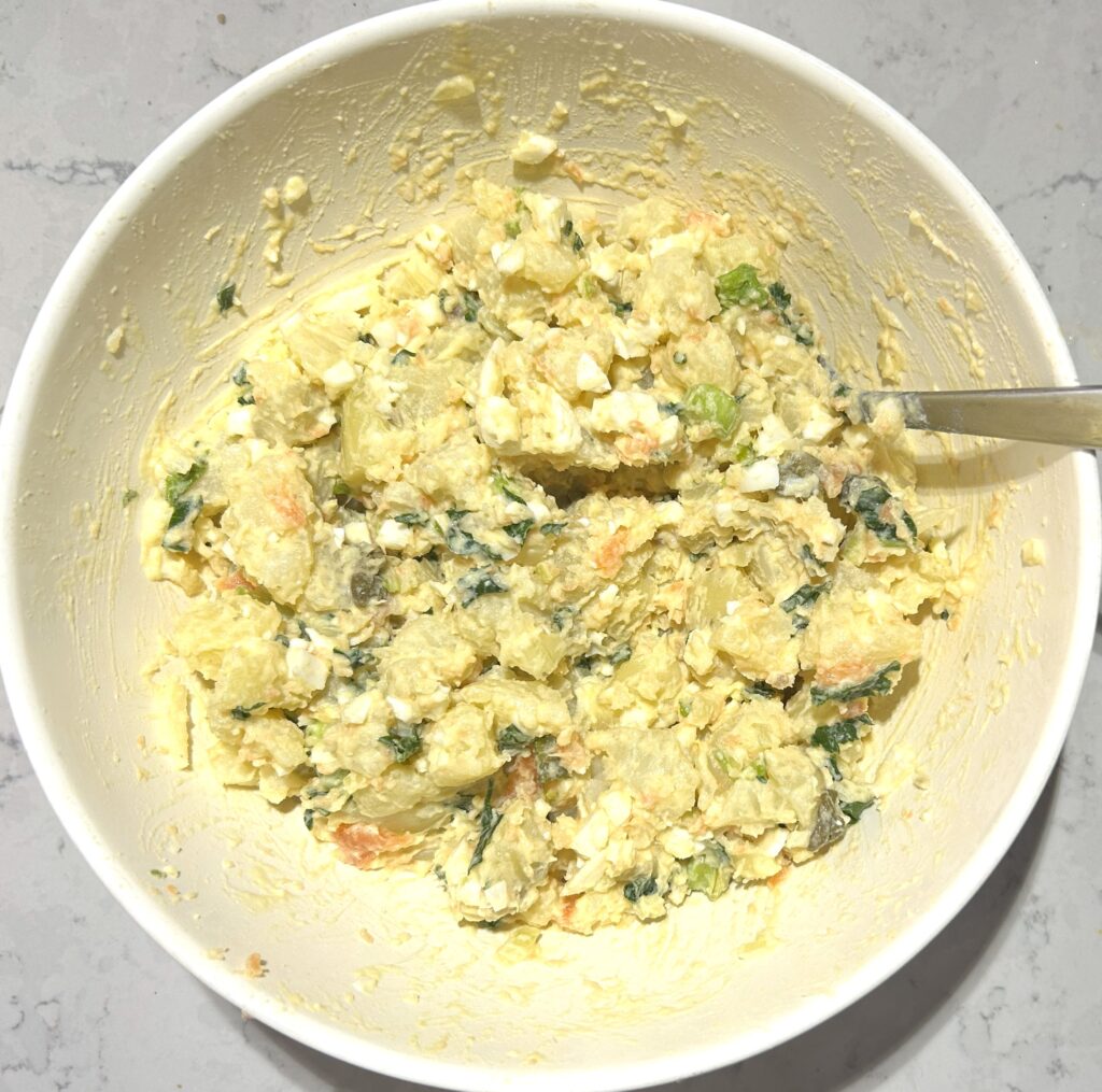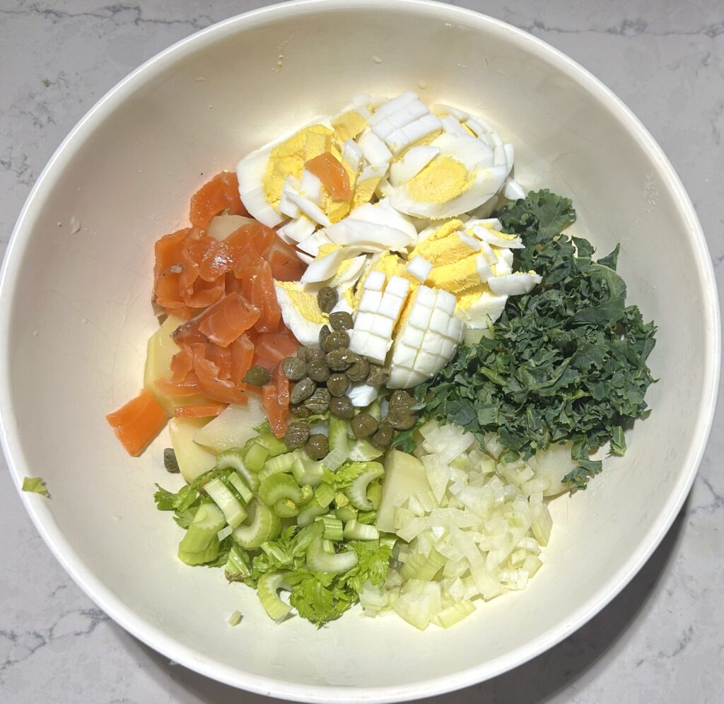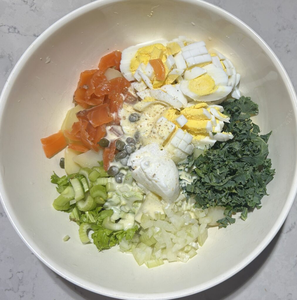 ❹茹で上がったじゃが芋は、水気に切って、ボールに入れる。玉ねぎ、セロリ、ケッパー、スモークサーモン、ゆで卵、ディル、ケールを加える。 ドレッシングの材料を入れて、全体をあえる。