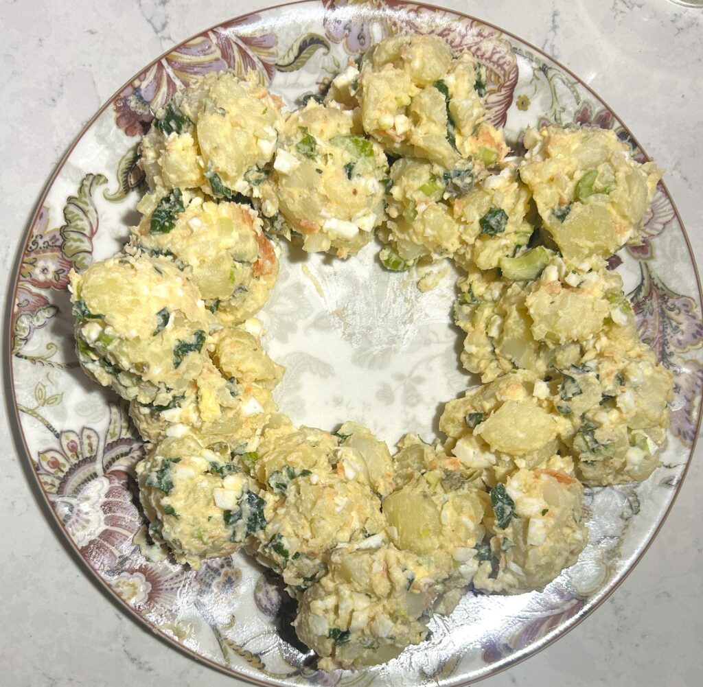 スモークサーモンを加えたポテトサラダを、リーズ状にもりつけた、サーモンポテトリースサラダ (salmon potato wreath salad) です。スモークサーモンをポテトサラダに加えると、より濃厚な味わいのポテトサラダになります。もちろん、リース状にしなくても、普通に盛り付けるだけでも美味しいです。