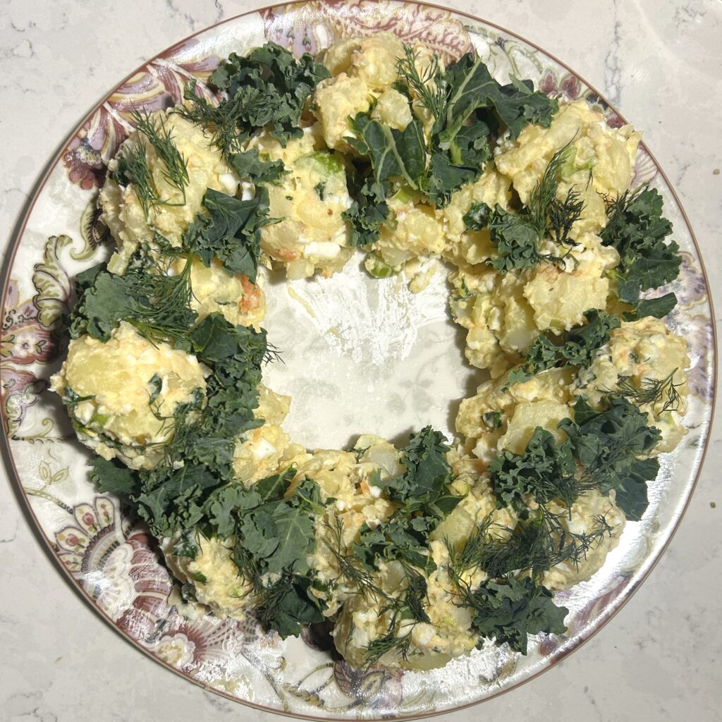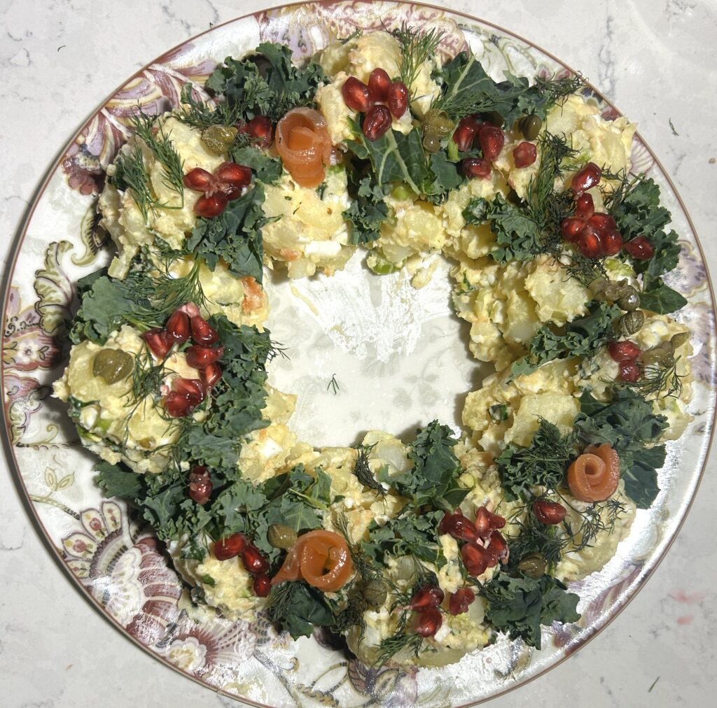 ポテトサラダは、もりつける形を自由に作れるので、リースサラダにむいています。表面に飾りつけるトッピングは、好みのものや手元にあるものを自由に選んで、ホリデー気分を盛り上げると楽しいです。