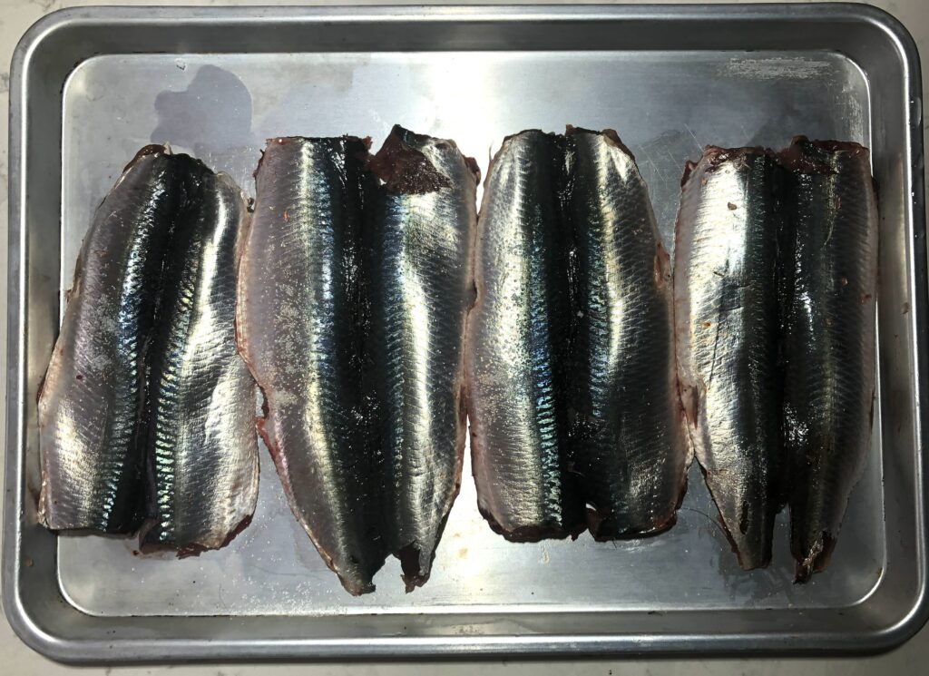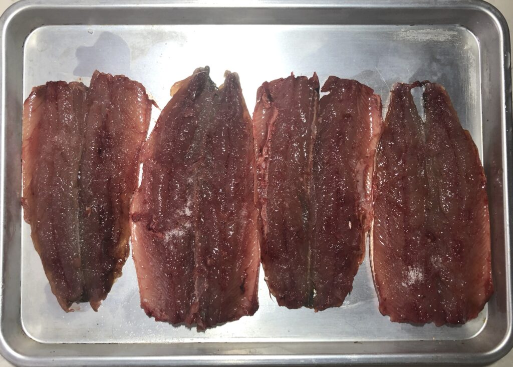 いわしは、頭と尾、背ヒレをとり、お腹の部分に包丁を入れて、半分に開きます。内臓と背骨、小骨をとりのぞきます。塩を表面にふっておきます。