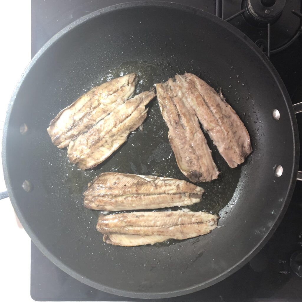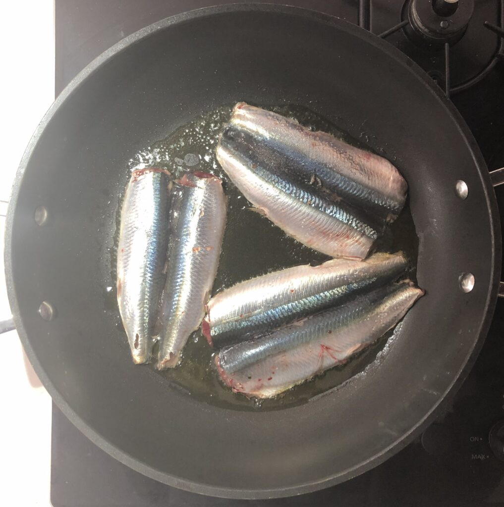 オリーブオイルを鍋にひいて、中火にかけます。いわしを入れて、両面に火が通るまで、焼きます。