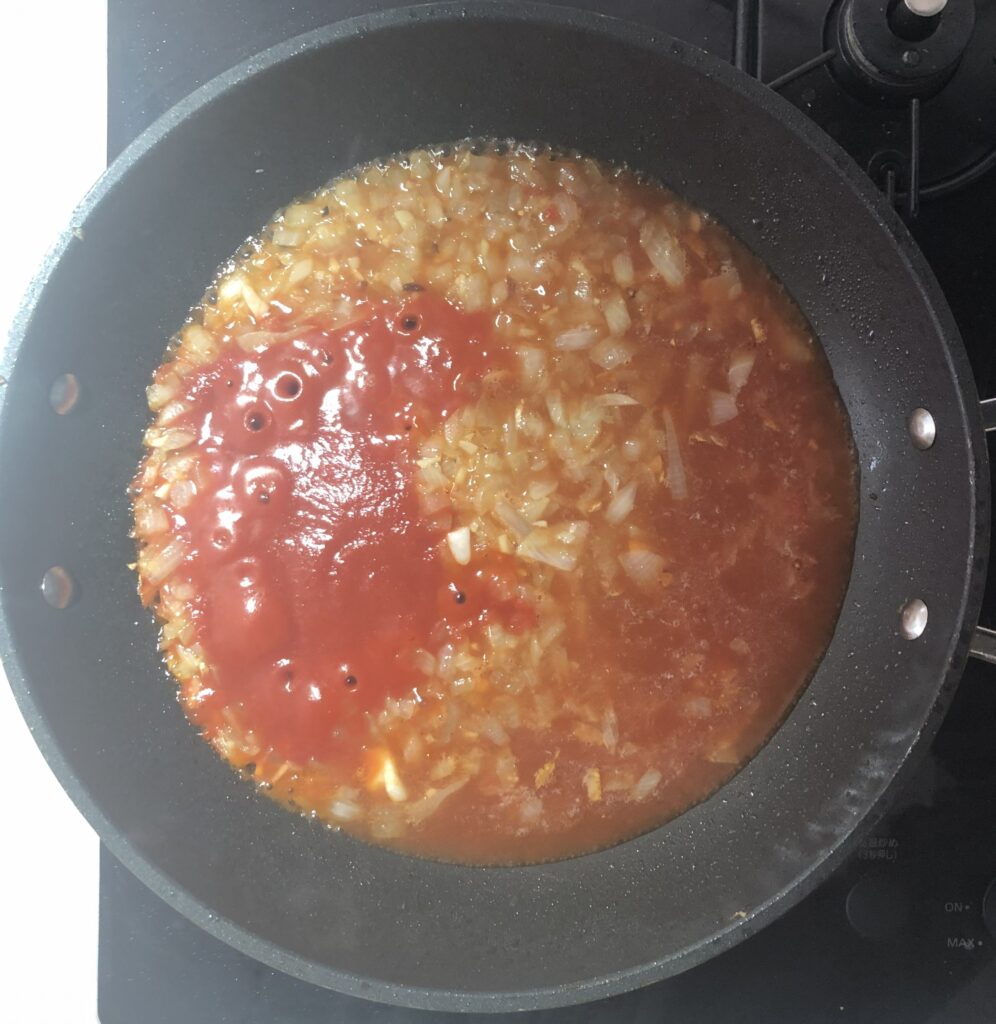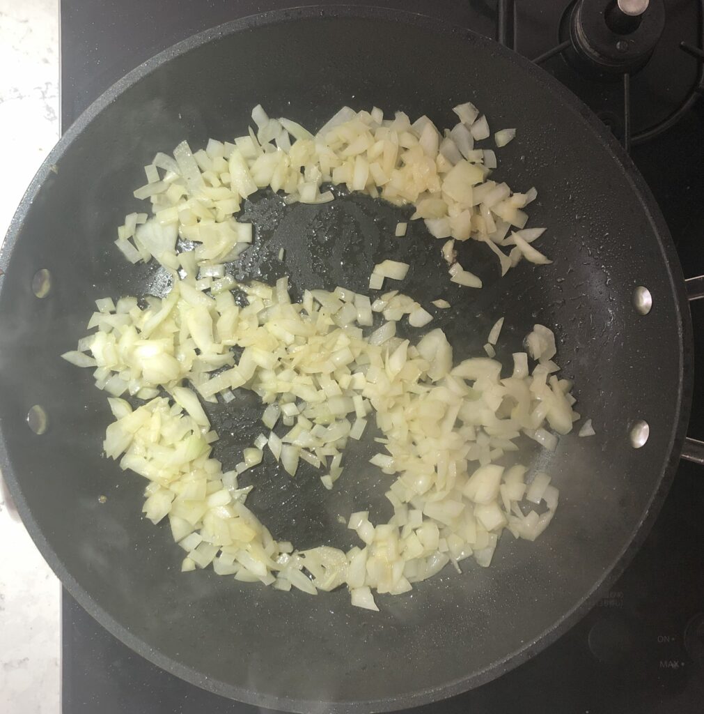 ❹いわしを焼いた鍋に、微塵切りにした玉ねぎを入れて、炒める。玉ねぎがしんなりとしてきたら、ニンニクを加えて、さらに炒める。