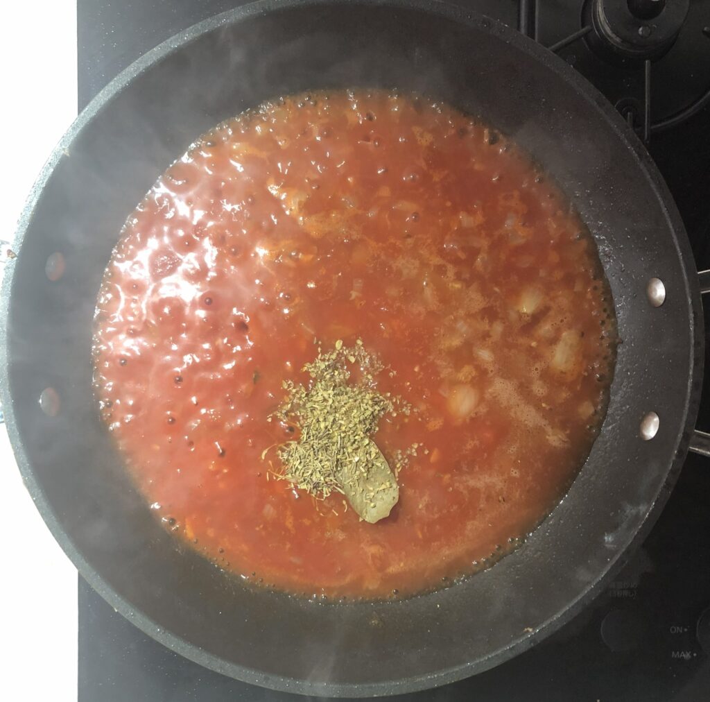 ローリエ、タイム、オレガノ、塩を加えます。好みで、微塵切りにした唐辛子を加えてもいいです。