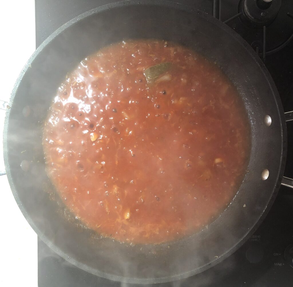 ❺白ワインを加えて、一度沸騰させる。続いて、トマトピューレ、水、オレガノ、タイム、ローリエ、塩を加えて、全体を混ぜ合わせる。弱火にして、沸々としてくるまで、火を通す。