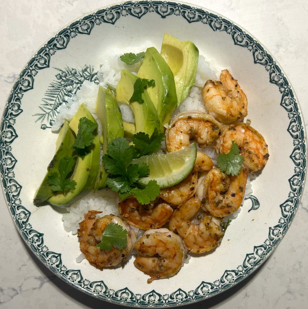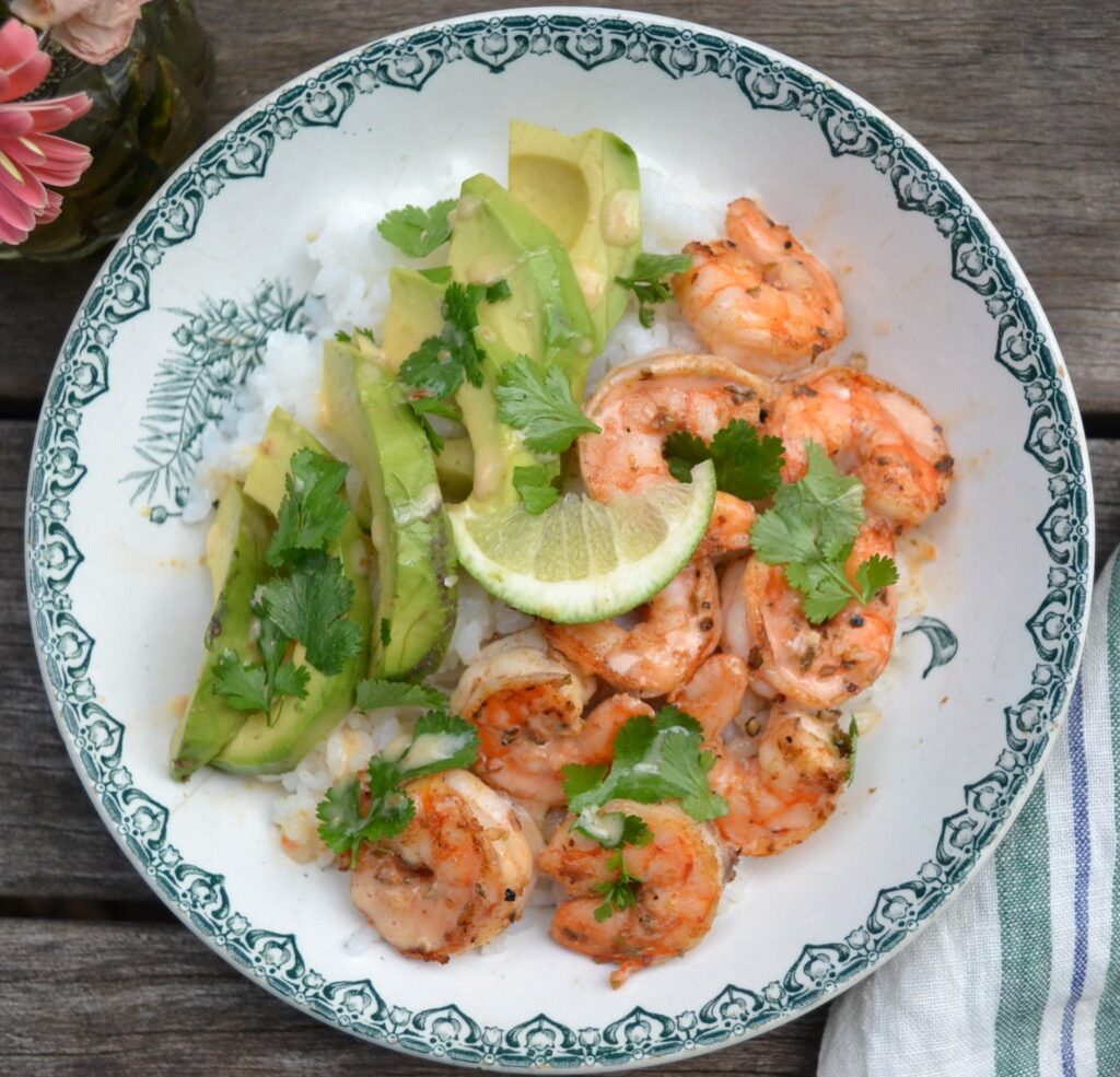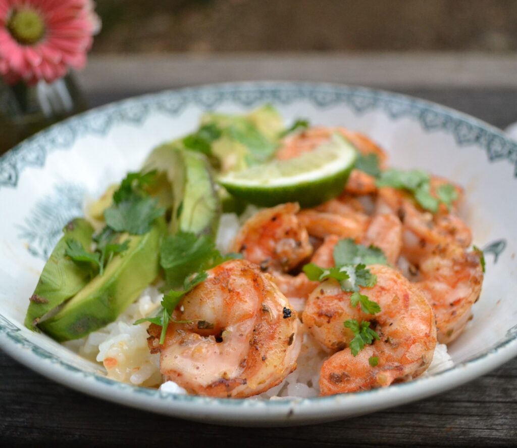 テックスメック風のスパイスを効かせた海老とアボカドを、炊いたお米と共にいただく、シュリンプアボカドライスボール (Shrimp Avocado Rice Bowl) です。ビーフタコスの材料で作る、タコライスの海老バージョンとも言えます。トルティーヤがなくても、手軽に調理しやすいお米で、テックスメックス風の味わいを楽しむことが出来るのは嬉しいです。お米は、日本のお米でも長粒米でも、玄米でも美味しいです。マヨネーズと、ライムの酸味を効かせたソースを添えています。