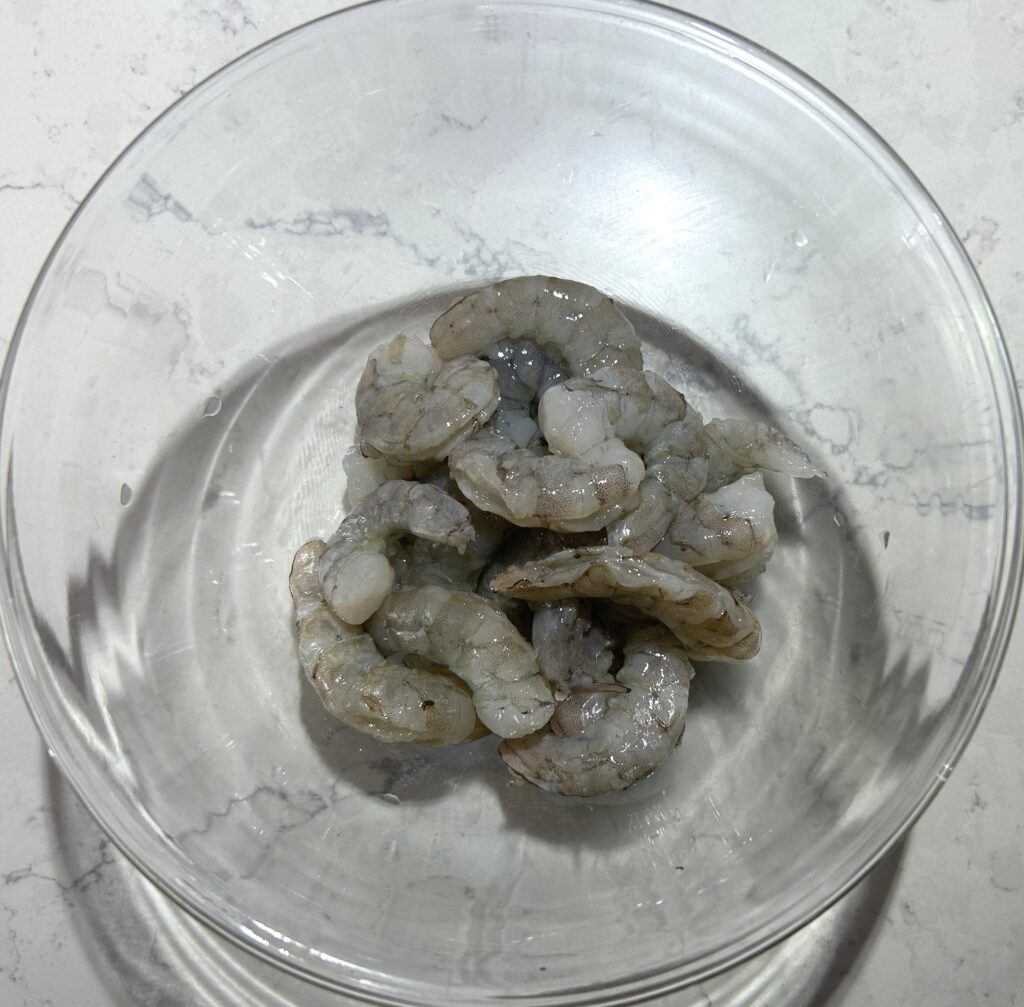 海老は、皮をむいて、腸を取り除きます。