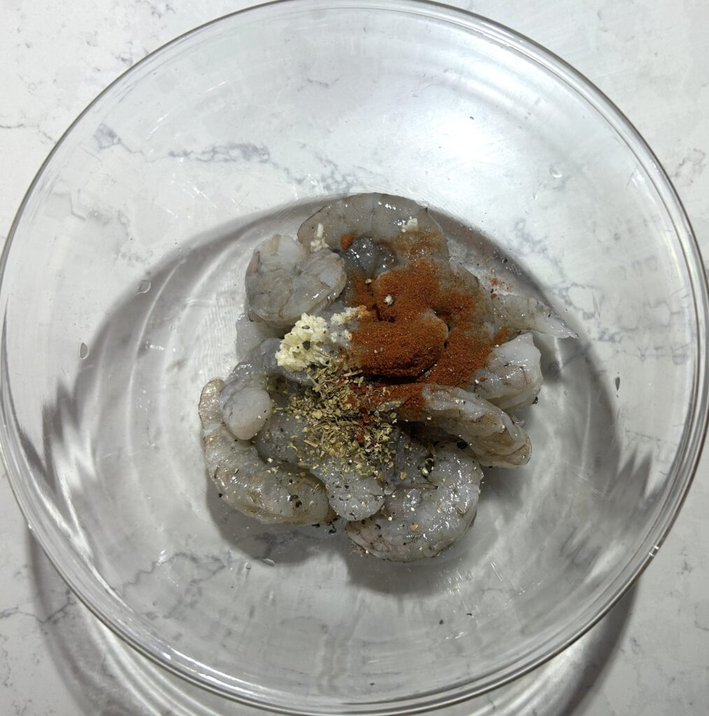 海老に下味をつけます。微塵切りにしたニンニク、オレガノ、クミン、パプリカ、ライムの果汁を加えて、よく混ぜ合わせます。