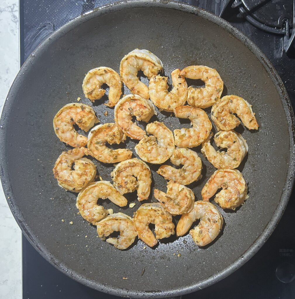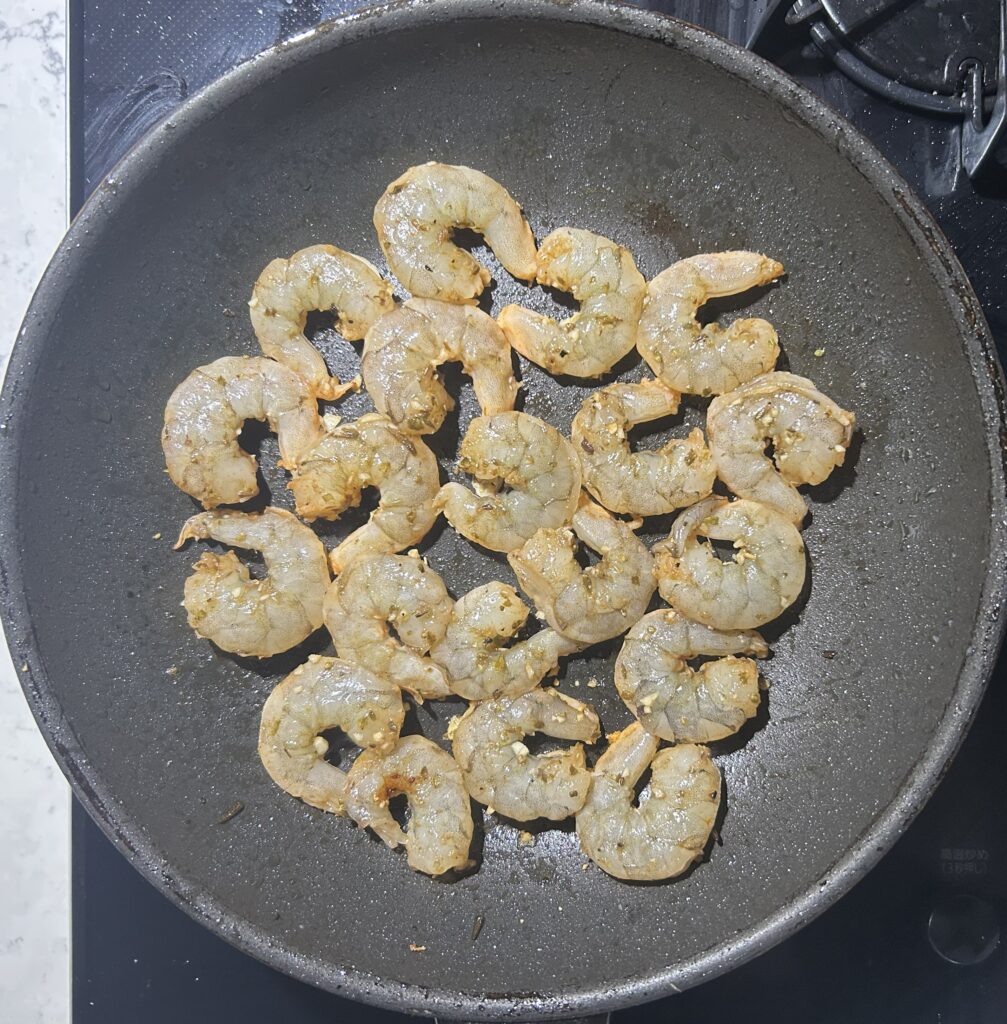 フライパンにオリーブオイルをひいて、中火にかける。海老を入れて、両面に軽く焦げ目がつくように焼く。