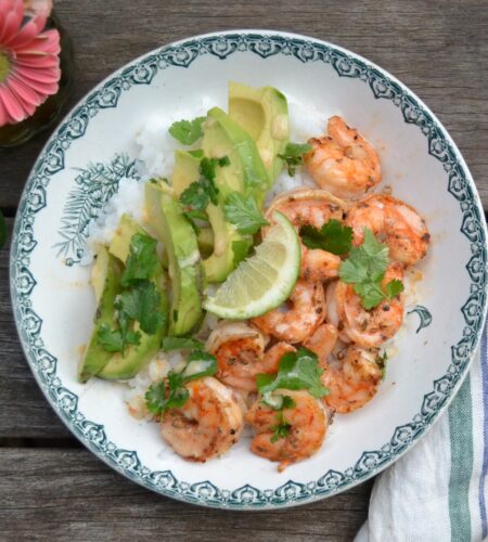 トマトをベースにしたリゾットに、ガーリック風味の海老を添えています。トマトのリゾットは、濃厚でしっかりとした味わいがある一方で、酸味がきいているので、いろいろな食材に合わせやすいです。トマトリゾットだけでも、満腹感のあるサイドディッシュになるし、チキンや他のメインの食材とあわせても美味しいです。