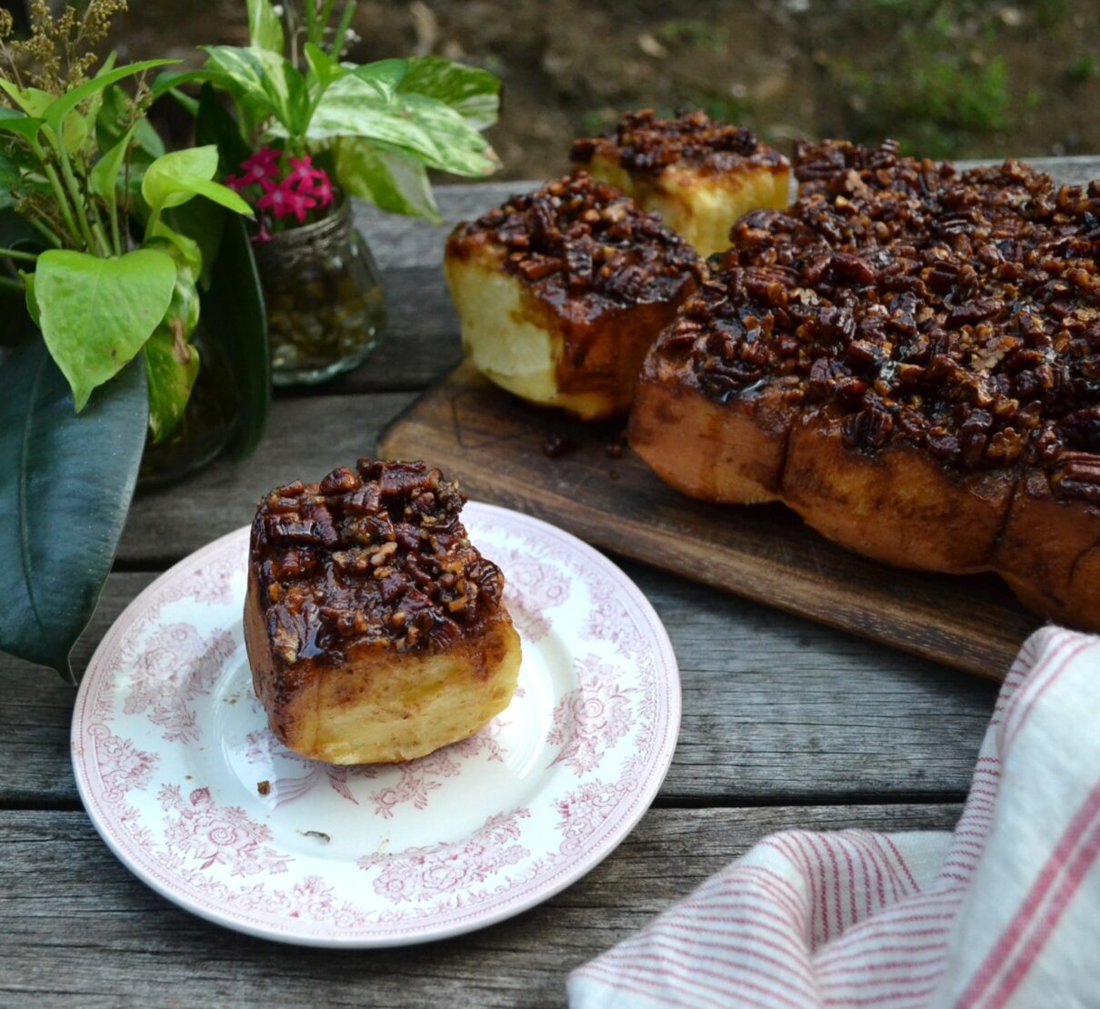 バターが多めのデニッシュ風の生地に、シナモンシュガーをロール状に包んで、ピーカンとキャラメルソースをトッピングした、スティッキーバン (Sticky Buns) です。スティッキーバンは、シナモンロールと似ていますが、シナモンロールを焼くときに、焼き型の底にキャラメルソースとナッツを敷き詰めてから、ロール状の生地をのせて仕上げます。焼きあがったら、焼き型に平なお皿などをかぶせて、ひっくり返すようにして、盛り付けます。言わば、アップサイドダウン (Upside Down) シナモンロールとも言えます。ナッツはピーカンを使っていますが、胡桃やアーモンドなどを使っても、同様に出来ます。ピーカンパイのような、濃厚なキャラメル風味を、シナモンロールで味わえるのが、とても魅力的です。