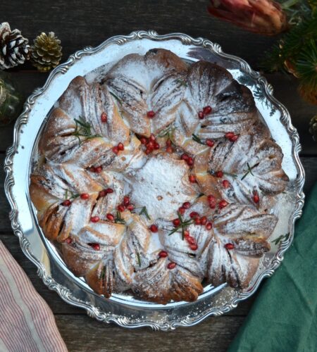 - 焼き上がったら、温かいうちに、溶かした無塩バターを表面に塗る。パンが手で触れるくらいに粗熱がとれたら、茶こしなどを使って、粉砂糖で表面を覆う。パンが完全に冷めてから、さらにもう一度粉砂糖をかけるようにする。