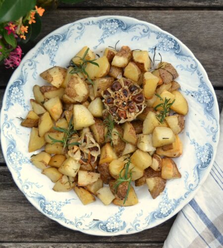 - バジルビネグレットを作る。ニンニクはみじん切り、バジルは葉の部分のみを適当な大きさに切る。