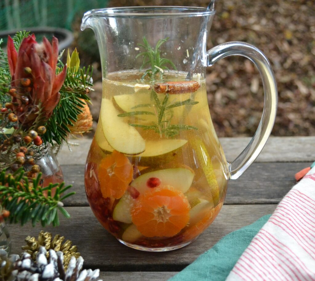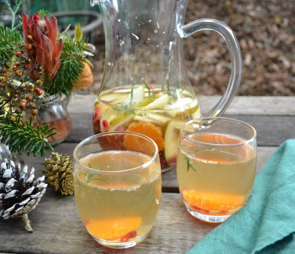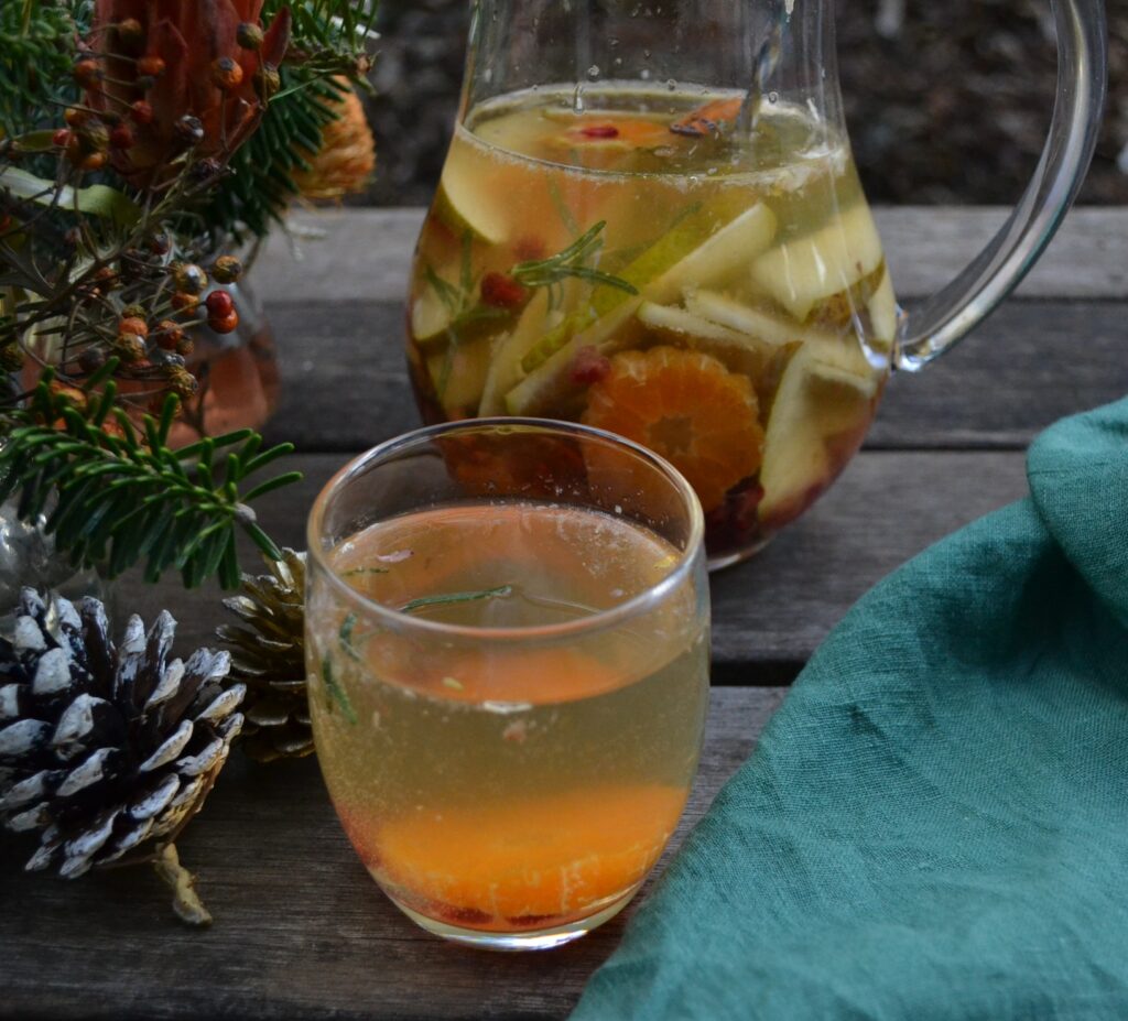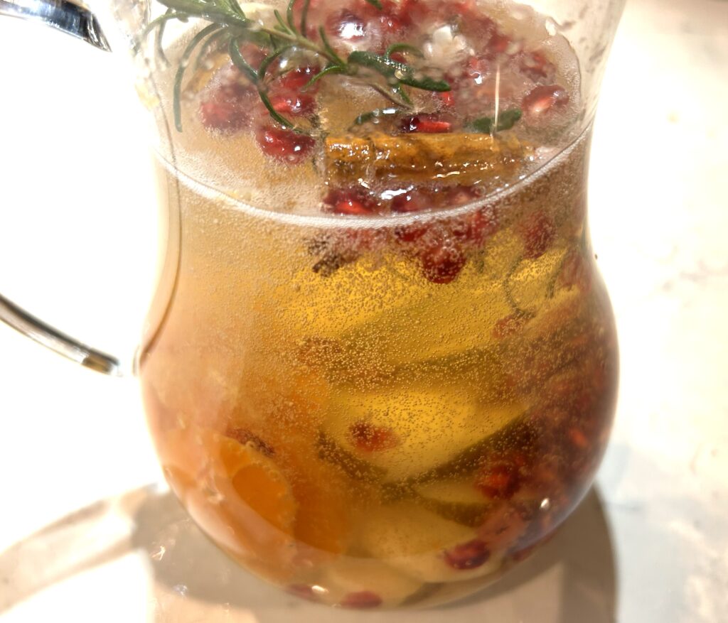 スパークリングワインをベースにして、洋ナシとウイキーを加えて作る、ホワイトクリスマスサングリア (White Christmas Sangria) です。ざくろの種とローズマリーを添えて、クリスマスらしい色合いがとても美しいです。洋ナシやウイスキーなど、意外な組み合わせのように見えますが、とても相性がよく、飲みやすいサングリアです。