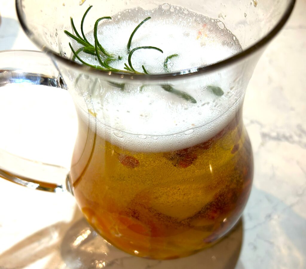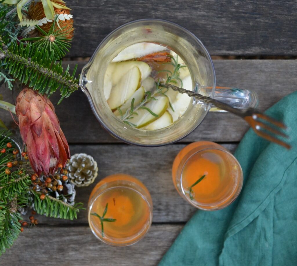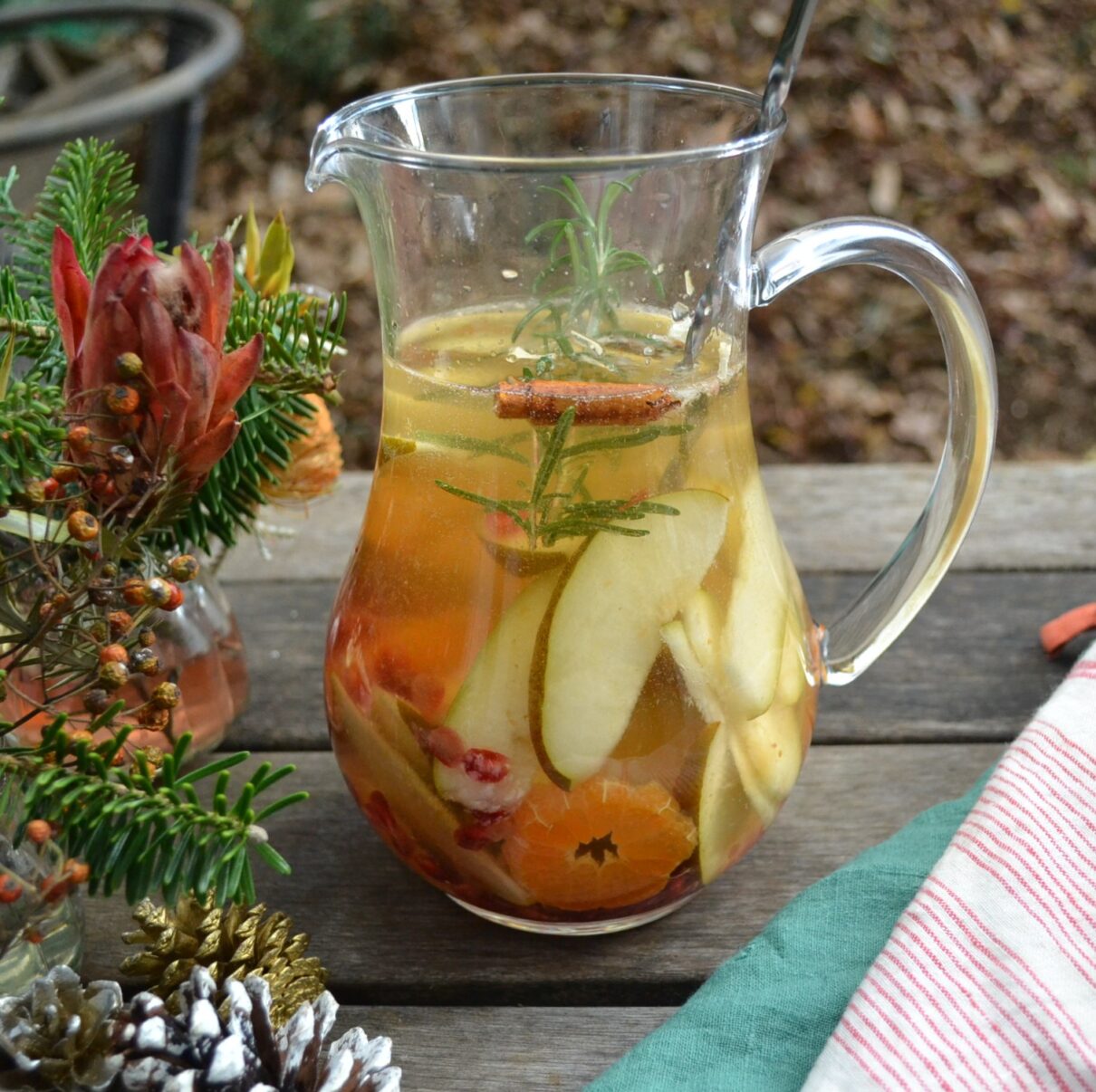 スパークリングワインをベースにして、洋ナシとウイキーを加えて作る、ホワイトクリスマスサングリア (White Christmas Sangria) です。ざくろの種とローズマリーを添えて、クリスマスらしい色合いがとても美しいです。洋ナシやウイスキーなど、意外な組み合わせのように見えますが、とても相性がよく、飲みやすいサングリアです。