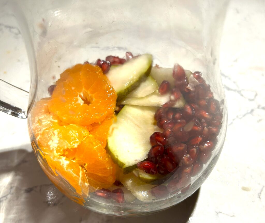 作り方は、基本的に材料をピッチャーに入れて混ぜるだけなので、とても簡単です。洋ナシは種をとって、薄切りにします。オレンジは輪切りにします。ざくろの種とともに、フルーツをピッチャーに入れます。