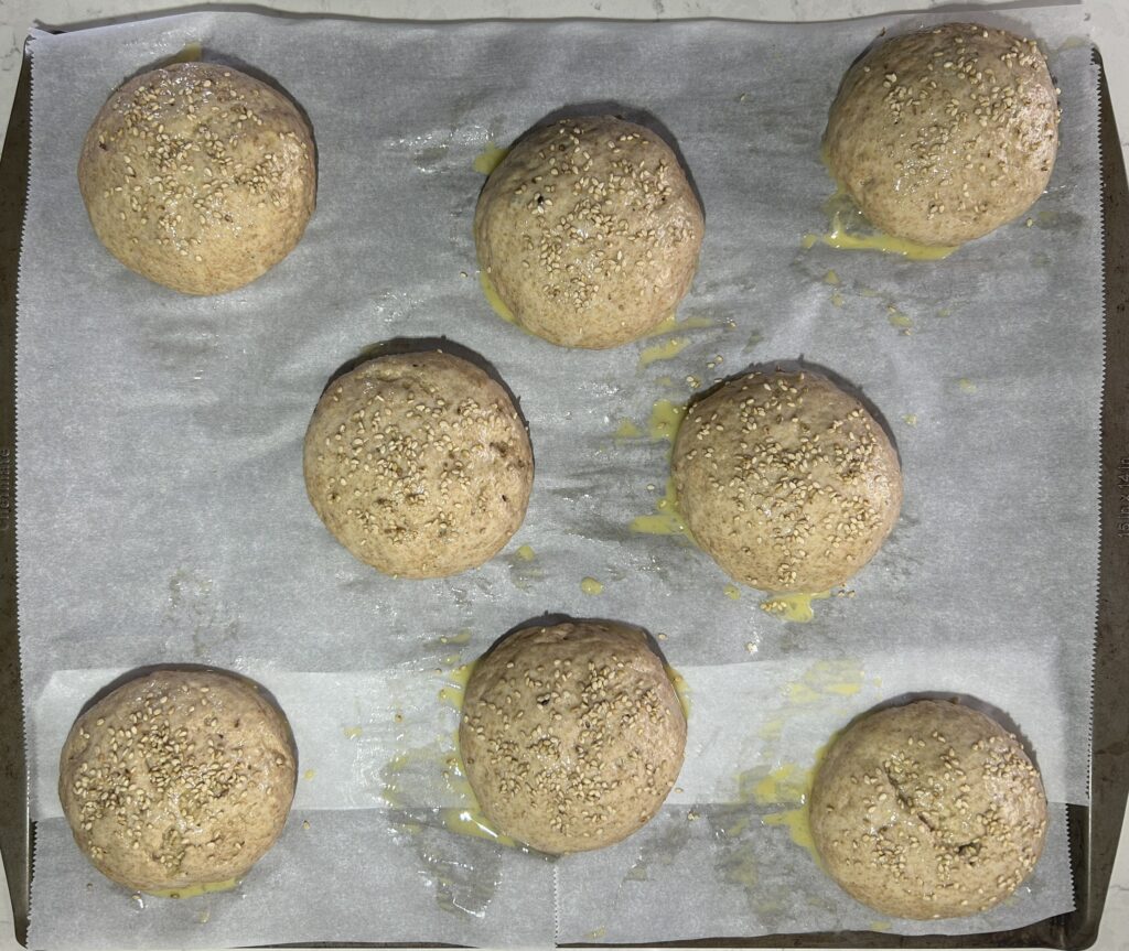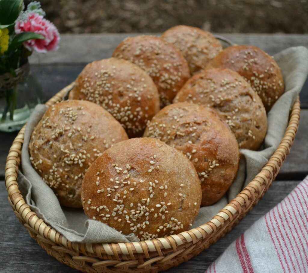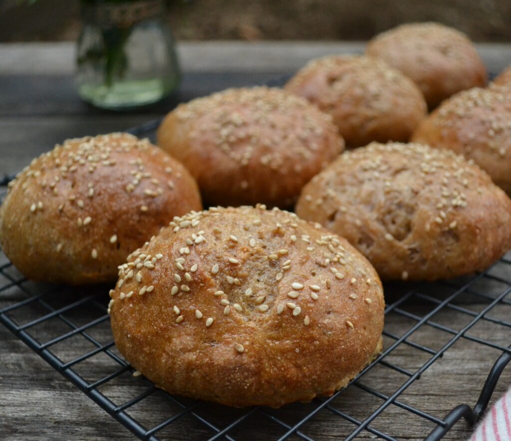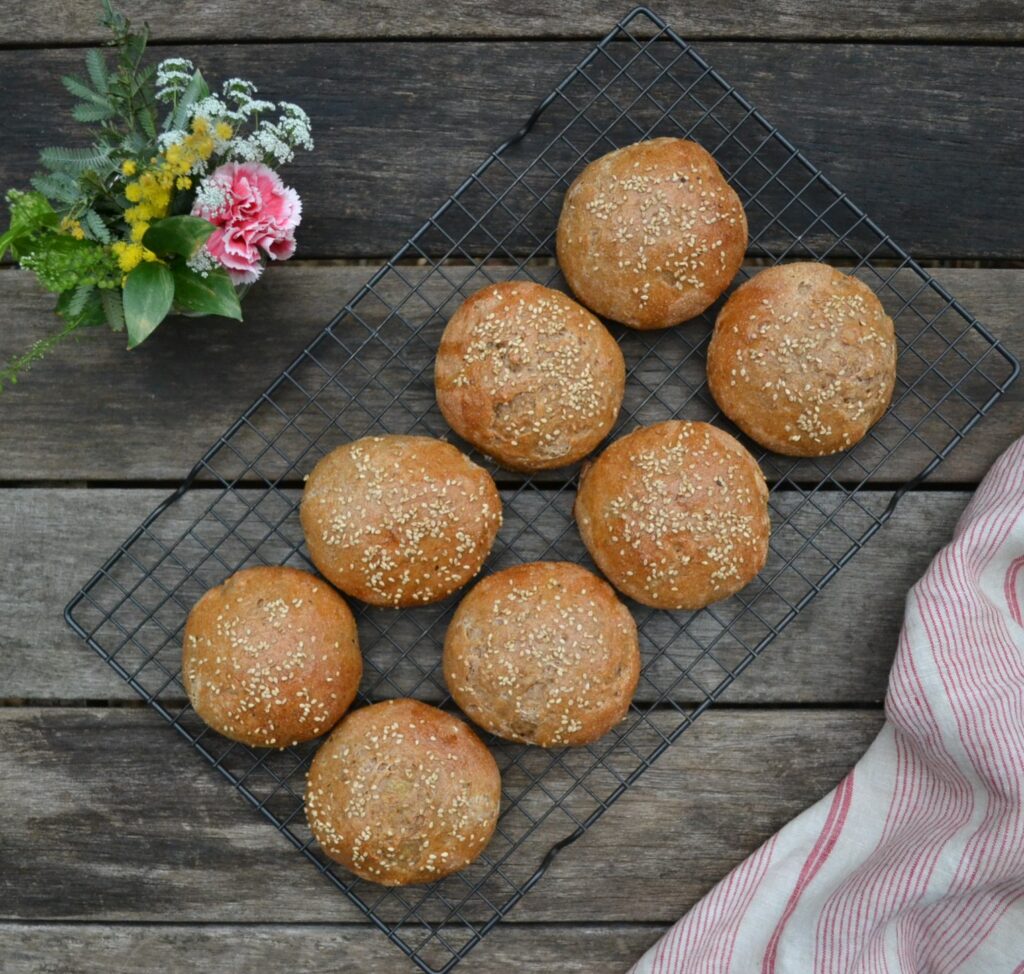 全粒粉を加えた生地でつくる、全粒粉のバンズ (Whole Wheat Buns) です。全粒粉の香ばしさが生きて、様々な食材とよくあいます。セイボリーなハンバーガーはもちろん、ジャムなどの甘い食材も、全粒粉の風味が生きて、甘さをひきたてます。バンズは、ハンバーガーなどアメリカ式のサンドイッチには欠かせないパンですが、いざ入手しようとすると、お店でなかなか売ってなかったりするので、家で手作りするのは、とても価値があります。胡麻やケシの実など、好みのトッピングをすることで、様々なバラエティーが楽しめます。