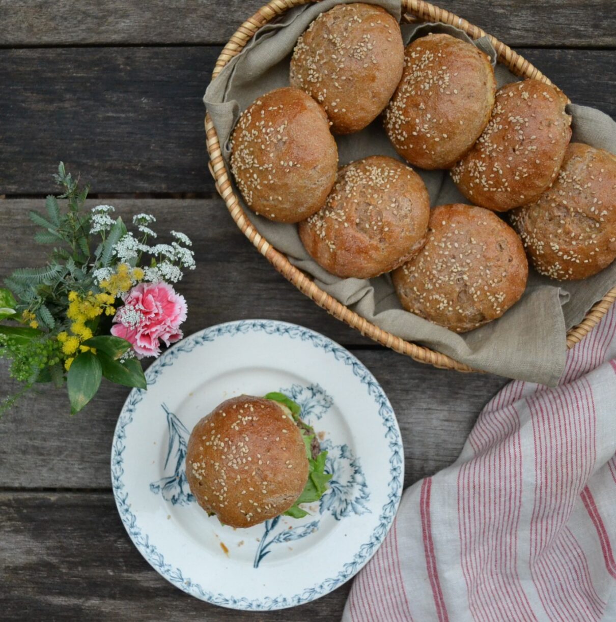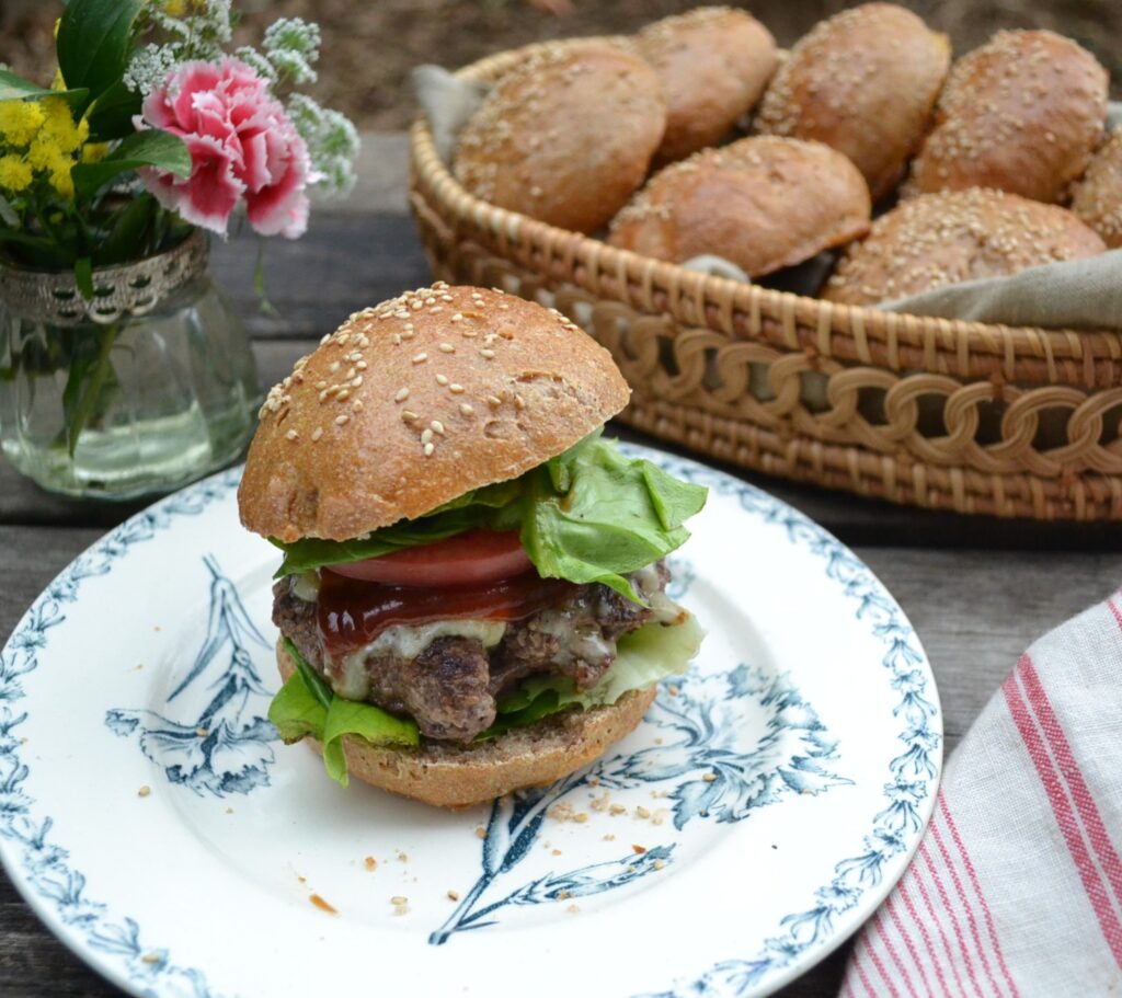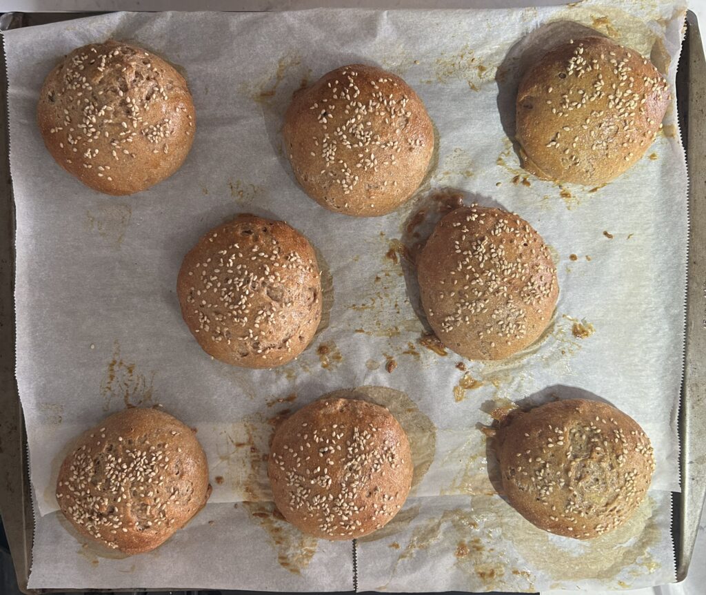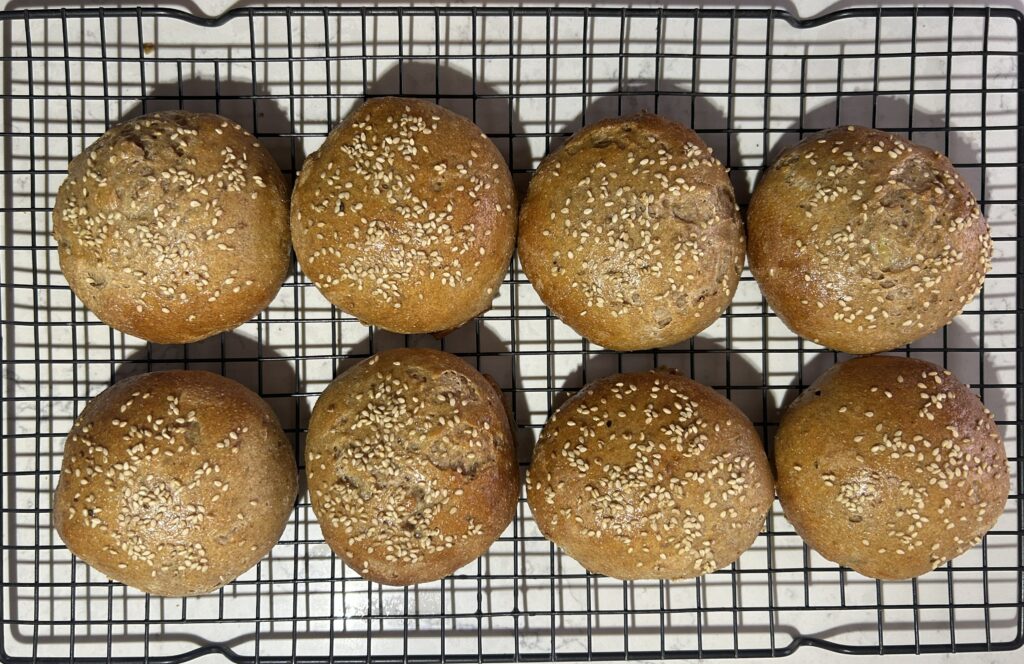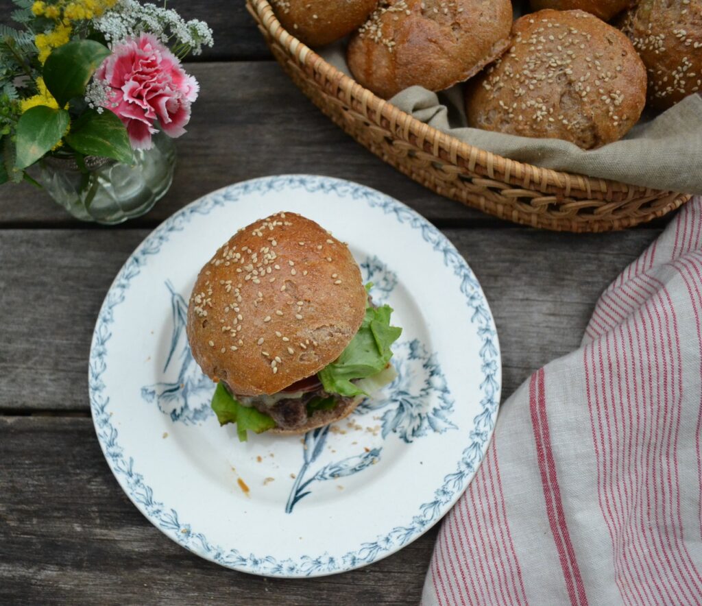 全粒粉を加えた生地でつくる、全粒粉のバンズ (Whole Wheat Buns) です。全粒粉の香ばしさが生きて、様々な食材とよくあいます。セイボリーなハンバーガーはもちろん、ジャムなどの甘い食材も、全粒粉の風味が生きて、甘さをひきたてます。バンズは、ハンバーガーなどアメリカ式のサンドイッチには欠かせないパンですが、いざ入手しようとすると、お店でなかなか売ってなかったりするので、家で手作りするのは、とても価値があります。胡麻やケシの実など、好みのトッピングをすることで、様々なバラエティーが楽しめます。