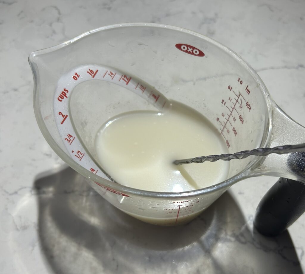 生地起こしした天然酵母に、35度から40度のぬるま湯を加えて、180mlに調整します。さらに、蜂蜜を加えて、混ぜ合わせておきます。
