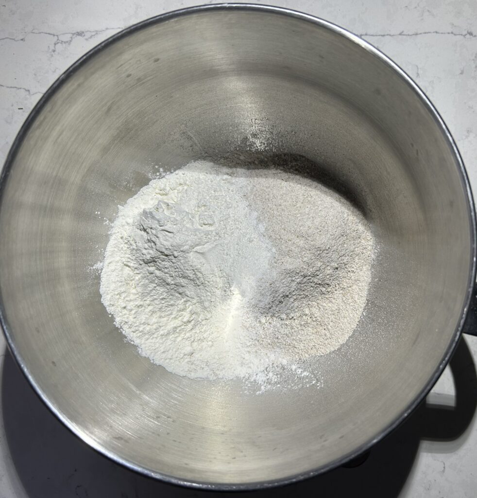 ボールに、全粒粉、小麦粉、塩を入れて軽く混ぜ合わせます。