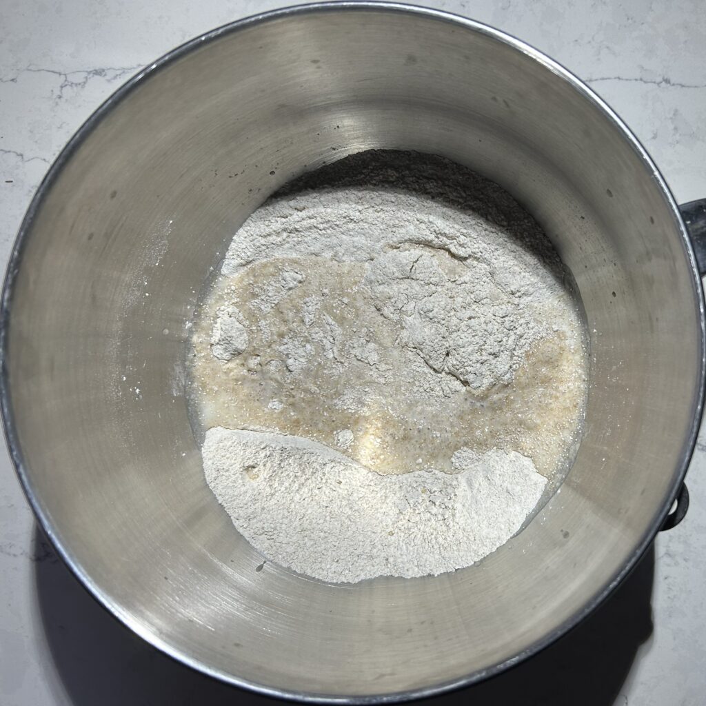 ❷強力粉、全粒粉、塩をよく混ぜ合わせ、❶ の生種と❷ の牛乳を少しずつ加えて混ぜ合わせる。粘り気が出るまで、よく混ぜ合わせる。