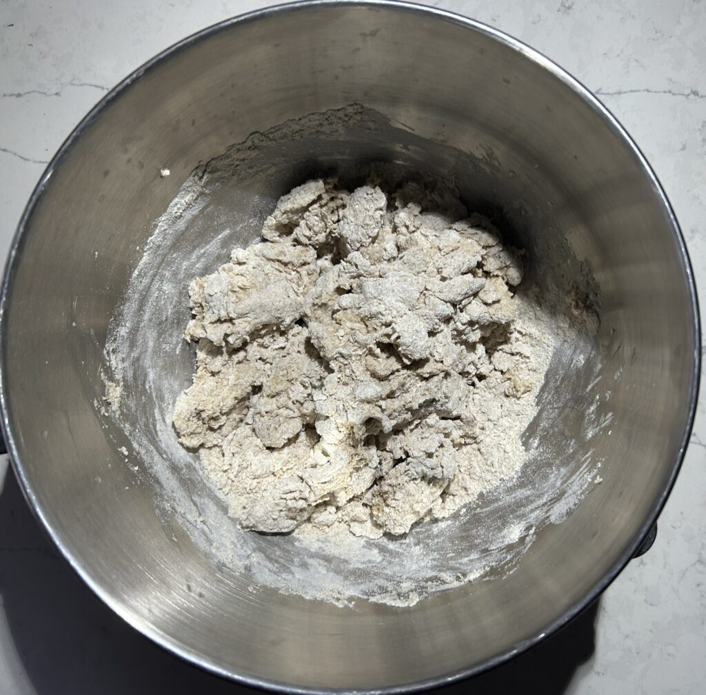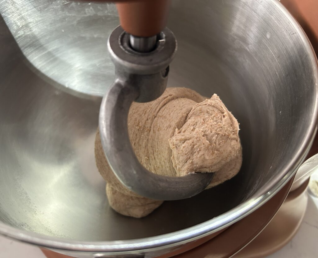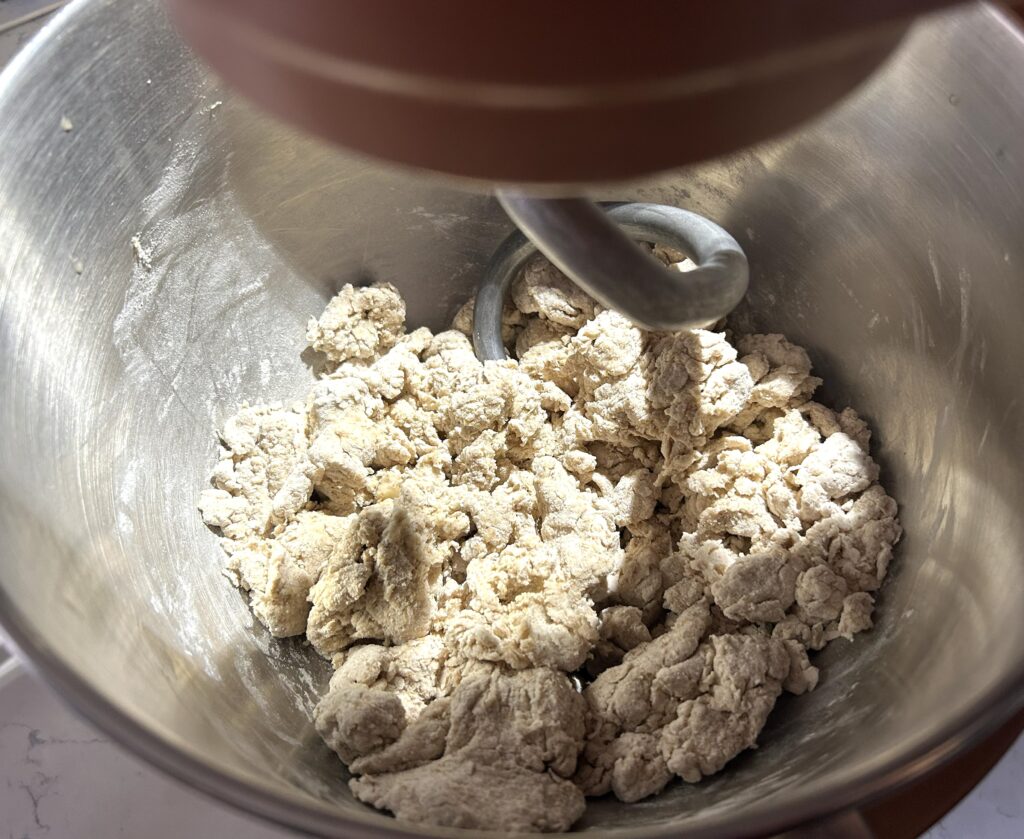 粉っぽさがなくなったら、スタンドミキサーにセットして、捏ねます。