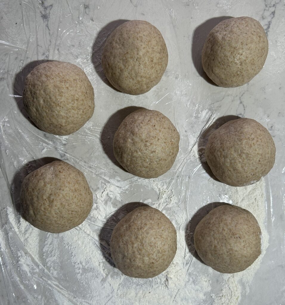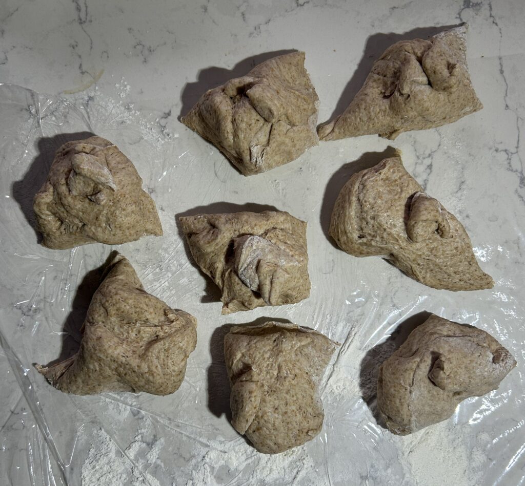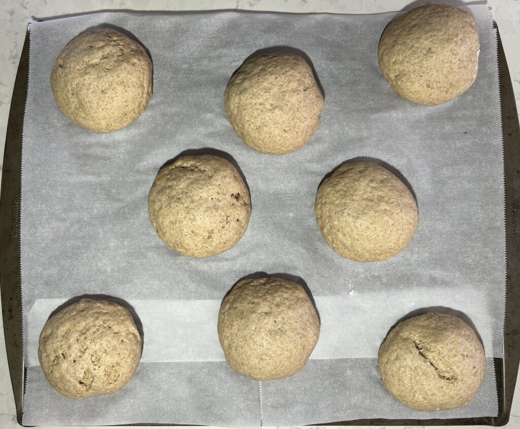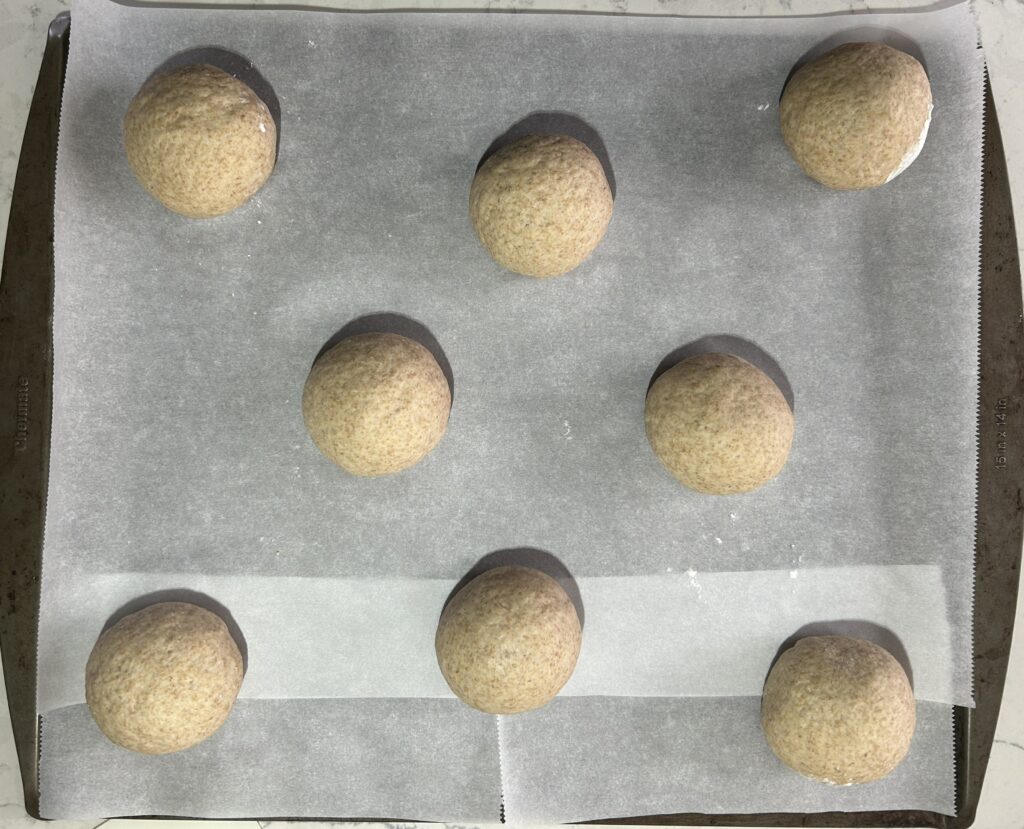 ❺生地を8等分に分割してボール型に成形する。ベーキング用の紙をしいた鉄板に十分な間隔を開けて並べる。表面に霧吹きで水をかけて、温かい室内において、発酵させる。